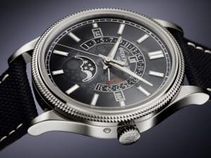 Reinterpretación del calendario perpetuo y la indicación de fecha retrógrada con el erotismo pudoroso de una carátula de zafiro metalizado.