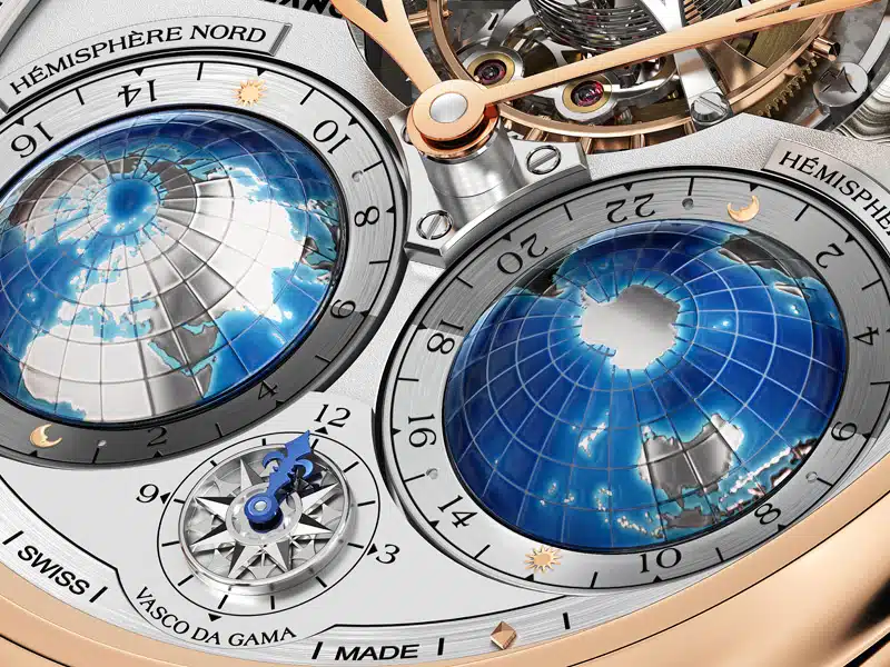 En la escena inferior, y en rigurosa simetría, las dos semiesferas terrestres fijas ilustradas con pintura en miniatura están rodeadas de discos que giran en sentido invertido (el del Hémisphere North siguiendo las manecillas del reloj) diferenciando el ciclo nocturno y diurno para leer intuitivamente en un poderoso juego de volúmenes la cartografía de la hora mundial. En la posición de las 6 h, una rosa de los vientos con flor de lis labrada recuerda el mármol de la base del monumento del Padrão dos Descobrimentos de la Parroquia de Belém en Lisboa, que vela para marcar la hora de origen después de zarpar rumbo a lo desconocido. Toda una mezcla entre arte de exquisitos pulidos, ciencia e incontinencia de recursos de la que sólo se crearán 18 unidades. (Por Carlos Alonso)
