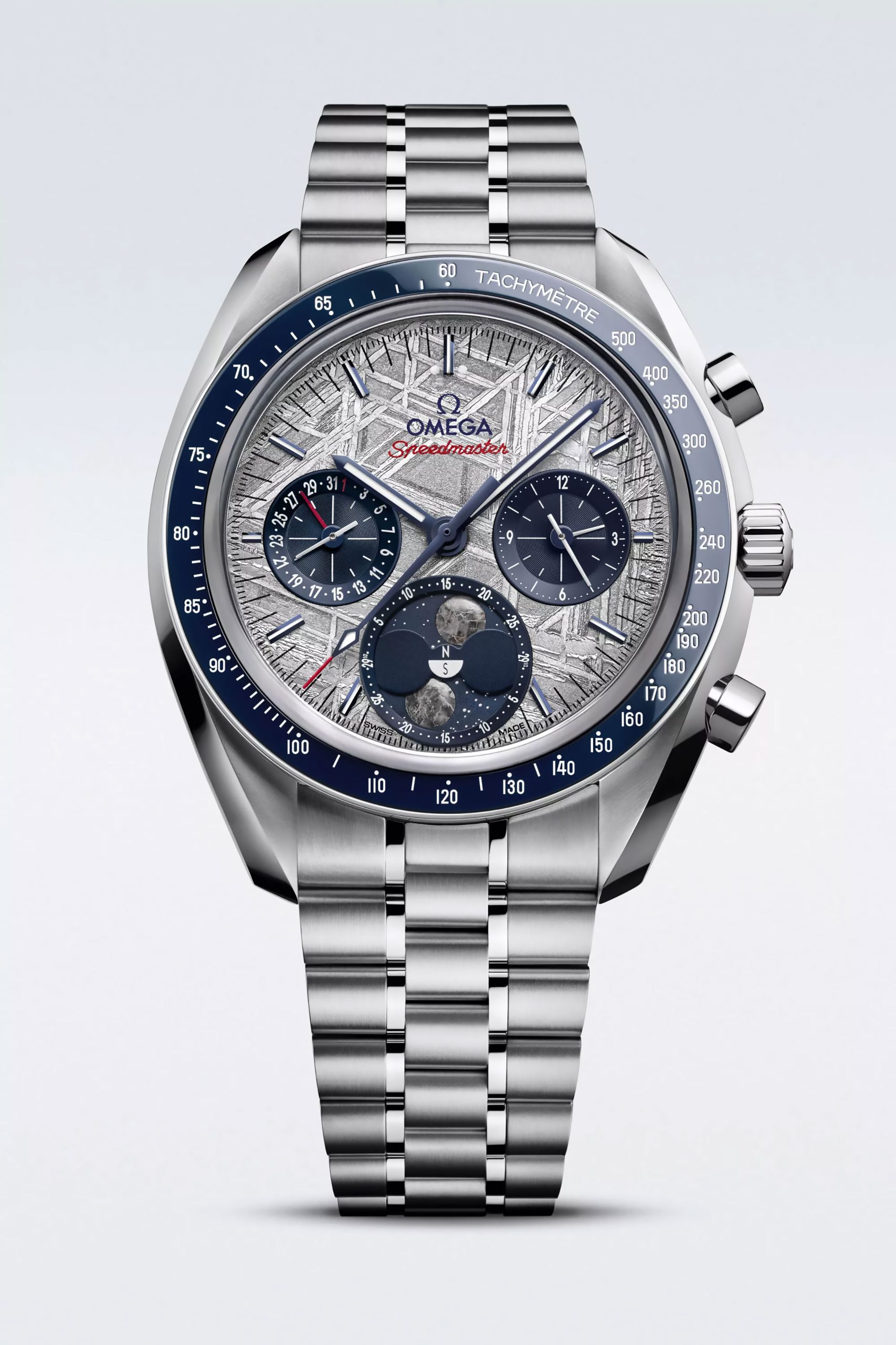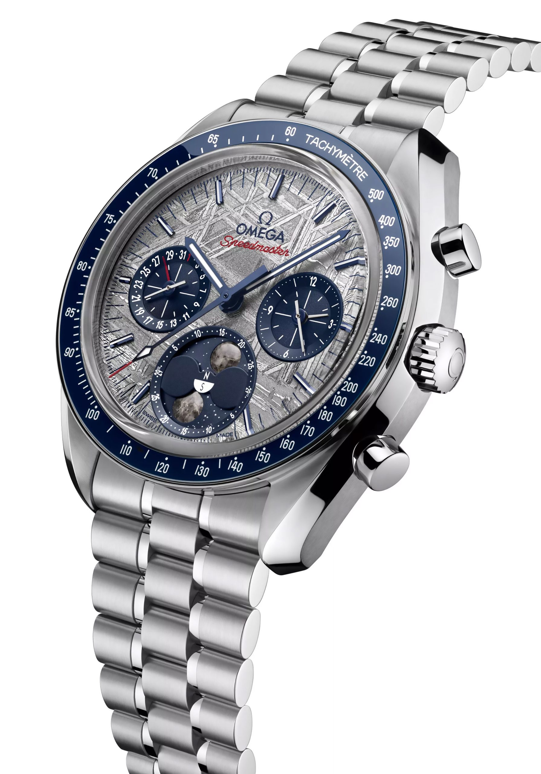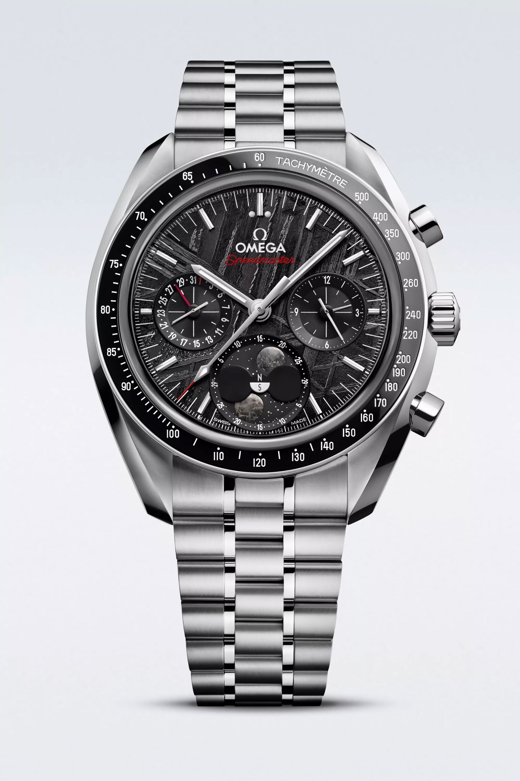 Y es precisamente este look de otra galaxia el que cautiva. El Speedmaster Moonphase Meteorite muestra a las 6 en punto, la indicación de las fases lunares, pero ahora con dos lunas en forma de cabujón, elaboradas a partir de piezas auténticas de meteorito lunar. A medida que giran, revelan los cambios de iluminación observados desde los hemisferios norte y sur.