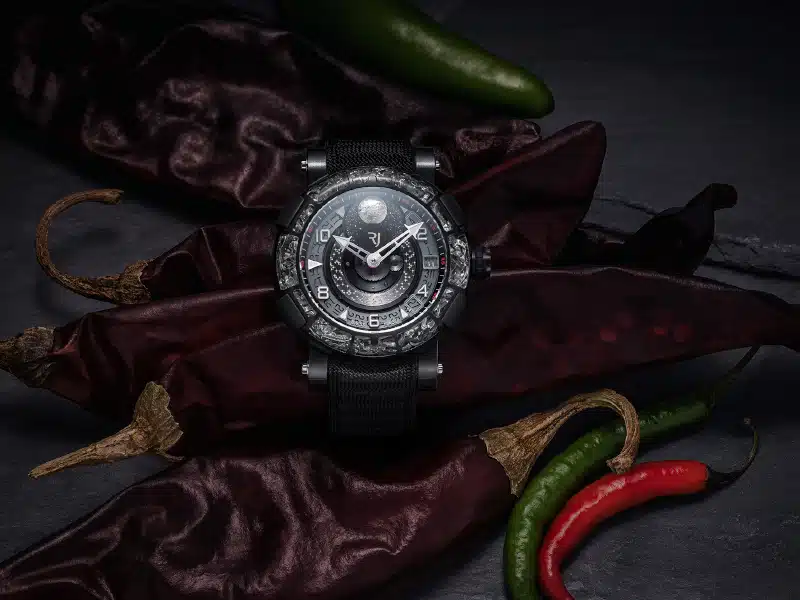 La caja de 45 mm tiene un un bisel de un material duro y ligero que puede combinar cristal acrílico de alto rendimiento con piezas de la nave Apollo 11. Se trata del primer material creado por RJ, el cual se fija en una rejilla metálica inspirada en el módulo de mando de la primera nave que llegó a la luna.
