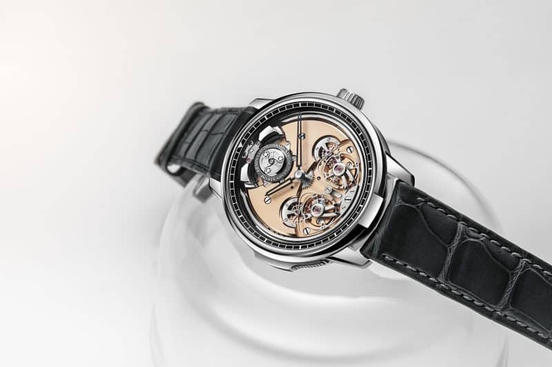 Cabe mencionar que cada componente ha sido meticulosamente acabado a mano, en consonancia con la complejidad mecánica de la pieza. Tanto los martillos, como los gongs y el muelle de embrague presentan un pulido espejo que contrasta con la platina y los puentes, con acabado esmerilado. El tratamiento de puldio a mano incluye también el anglage sobre los bordes y los orificios. El regulador volante también presenta una superficie grabada en mate que contrasta elegantemente con los bordes biselados y el granado circular de los puentes superiores.