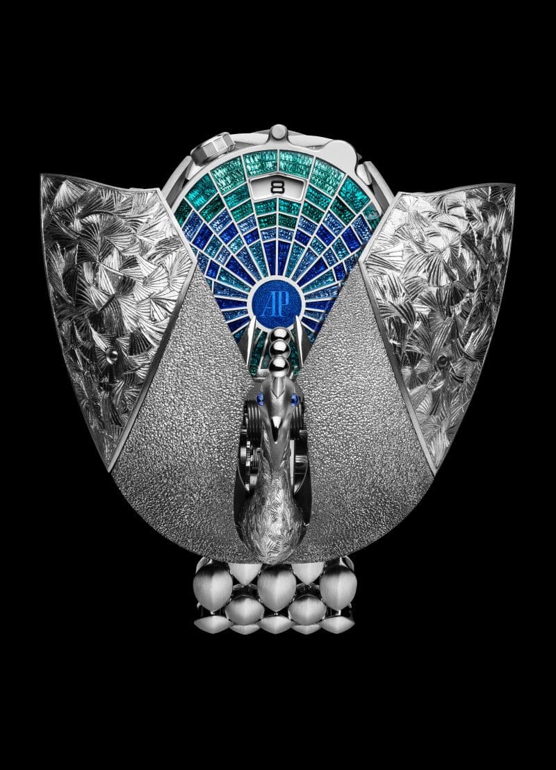 Inspirado en los relojes secretos, el Établisseurs Peacock muestra en su forma cerrada una especie de escarabajo de oro blanco que, al abrirse, revela un pavo real en miniatura. Esta pieza destaca por su esfera de esmalte translúcido grabado a mano, el Calibre 3098 –movimiento de cuerda automática calibrado a 21,600 alternancias por hora (3 Hz) –, así como por su brazalete de eslabones con forma de plumas. Algunos de los nombres involucrados en darle vida a este ejemplar son el joyero Ywan Kuntzle; la responsable del esmaltado de la carátula, Vanessa Lecci, o el mismísimo Giulio Papi para la creación del mecanismo “secreto”, entre otros especialistas más. Tres variantes estarán disponibles a partir del próximo año.