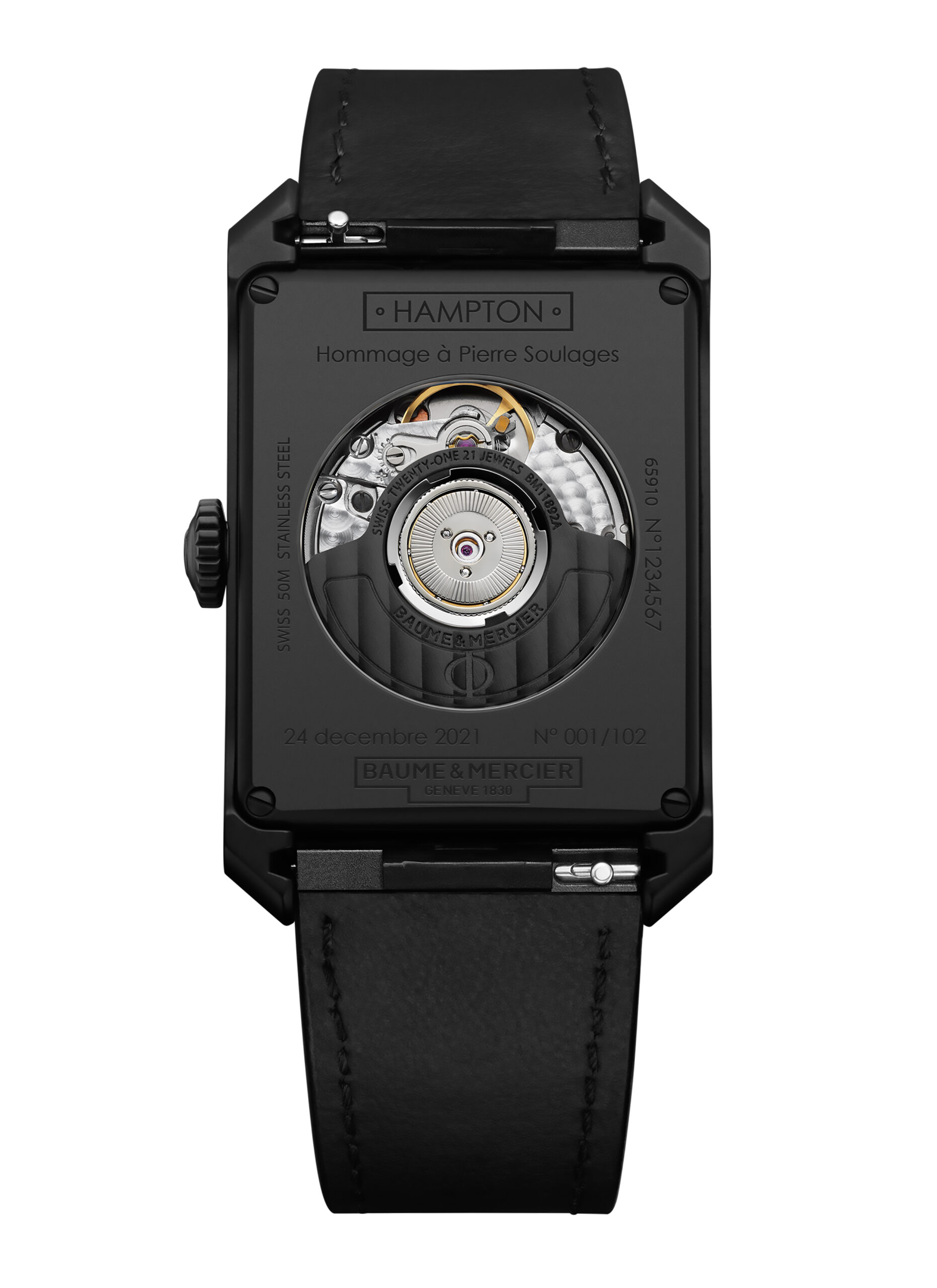 Un reloj también puede ser el escenario de una obra de arte y es lo que Baume & Mercier ha hecho con el Hampton, transformado en el mejor lienzo para reproducir una obra de la serie Outrenoir de Pierre Soulages. Con un minimalismo formal marcado por la sobriedad, esta creación se hace eco de la pureza que caracteriza la pintura del artista abstracto. El proyecto se inspira especialmente en una pieza, la Peinture (390 x 130 cm 17 mars 2019).