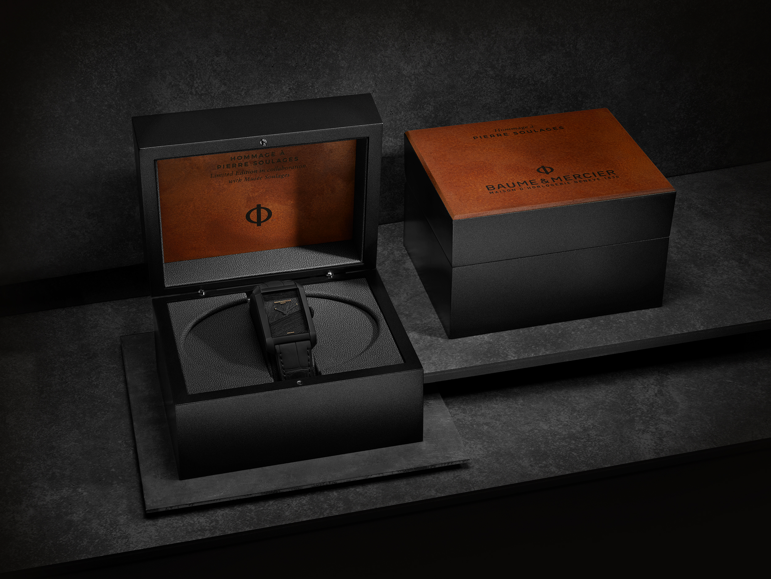 El estuche exclusivo en que se presenta el reloj rinde homenaje a la arquitectura contemporánea del Museo Soulages. Un trabajo del estudio catalán RCR arquitectes ganador del premio Pritzker en 2017. El reloj va acompañado de un folleto explicativo de la colaboración y un pase VIP para dos personas para el museo Soulages. También enviarán un libro sobre la obra de Pierre Soulages a cada comprador de una de estas creaciones. Este modelo se producirá a petición, dentro de una edición limitada de 102 ejemplares (en honor a la edad del artista) numerados individualmente.