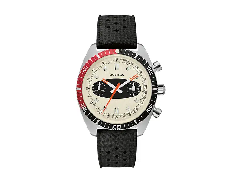 Es la ola vintage, así que no hay nombre más apropiado. Bulova regresa a sus felices años 70 y recupera el conocido “Surfboard” —el Bulova Chronograph A—. Un cronógrafo deportivo que jugaba abiertamente con el diseño de las cajas y carátulas coloridas bajo clara influencia de la psicodelia que marcaba aquel momento histórico. Su apelativo “Surfboard” surgió de la forma del dibujo en el dial.