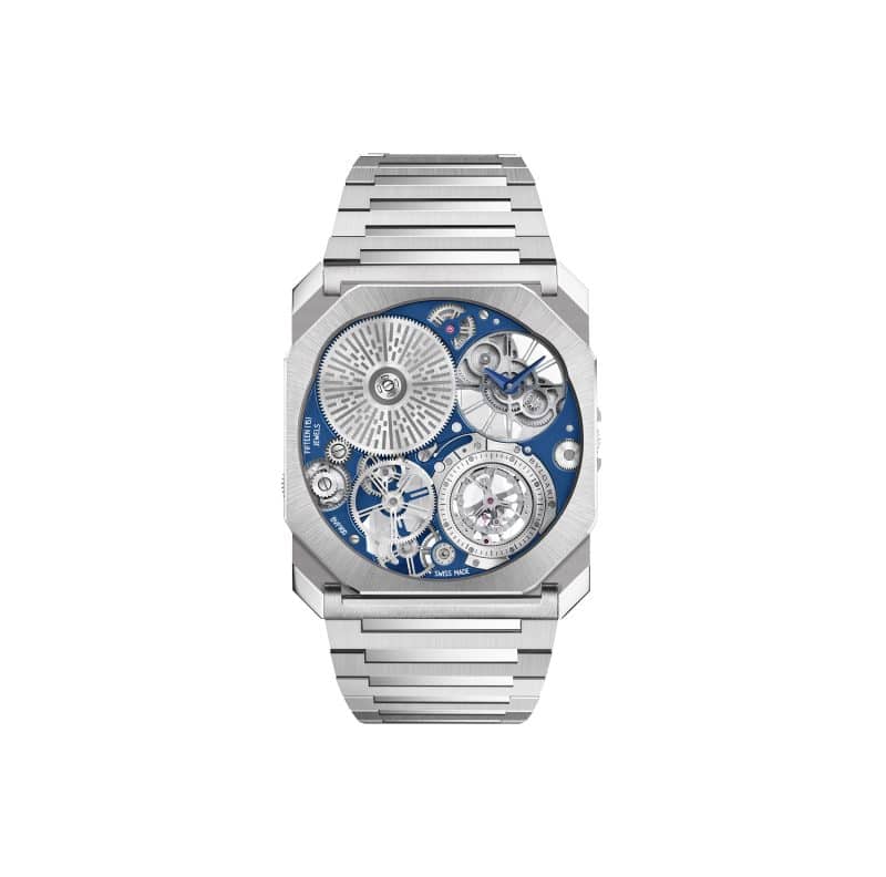 Las diferencias fundamentales entre el Octo Finissimo Ultra Tourbillon de 2025 y el nuevo modelo radican, principalmente, en el uso de platino para la caja. Además, tiene una esfera esqueletada que permite vislumbrar algunos segmentos inferiores en color azul. Asimismo, lasmanecillas de la hora y los minutos han sido esqueletados y tratados con un recubrimiento en PVD azul.