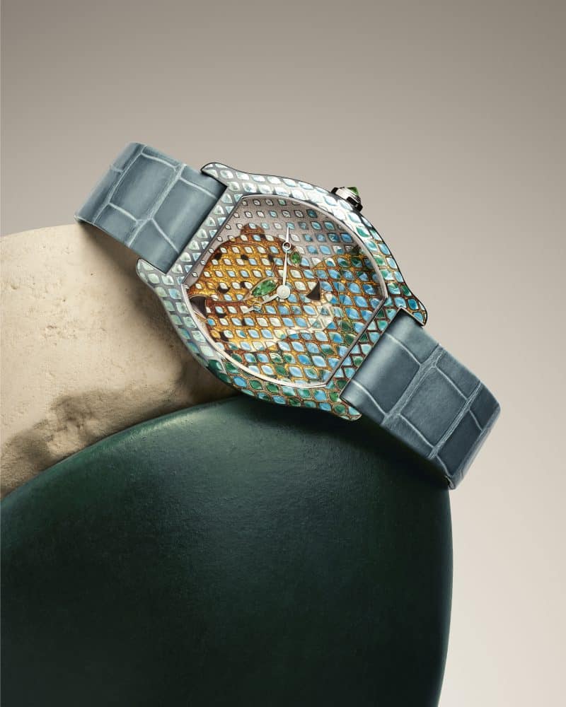 Para la ocasión, Cartier sitúa a la Panthère en el centro de la esfera. Gracias a la técnica de esmalte excavado de dos niveles, el emblemático felino aparece tras una cortina de lluvia. Su ejecución es notable: el esmalte requiere más de 130 horas de trabajo por pieza, con más de 15 tonos y 36 procesos de cocción individuales. En la versión de oro blanco, la Panthère luce ojos de esmeralda; en la de oro amarillo, adopta el verde de la tsavorita.