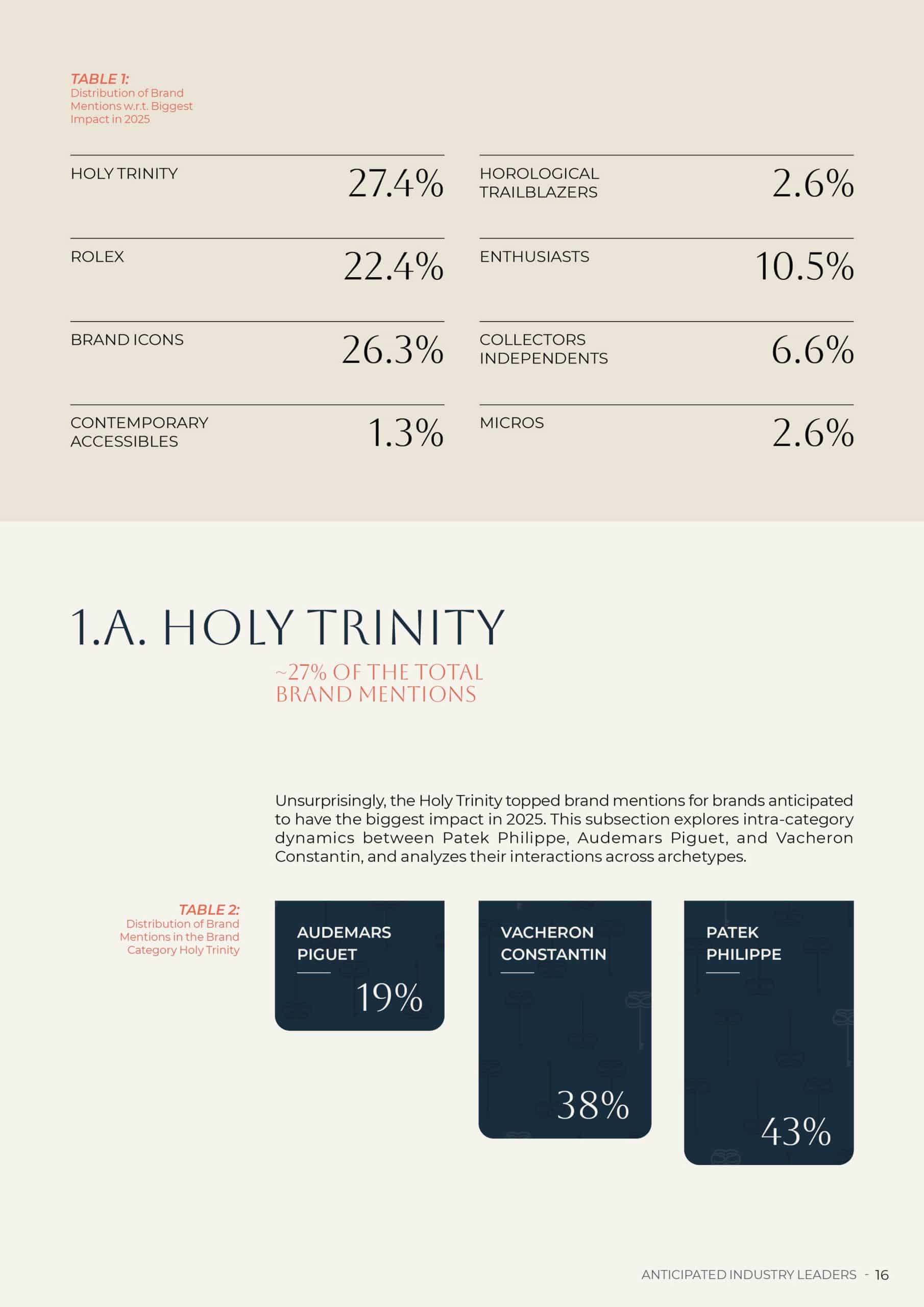 Por ejemplo, el 47 % de los encuestados considera que Breguet tiene el mayor potencial para recuperar su creatividad histórica. También se menciona a Girard-Perregaux y Universal Genève como marcas con capacidad para destacar en la categoría de Entusiastas.