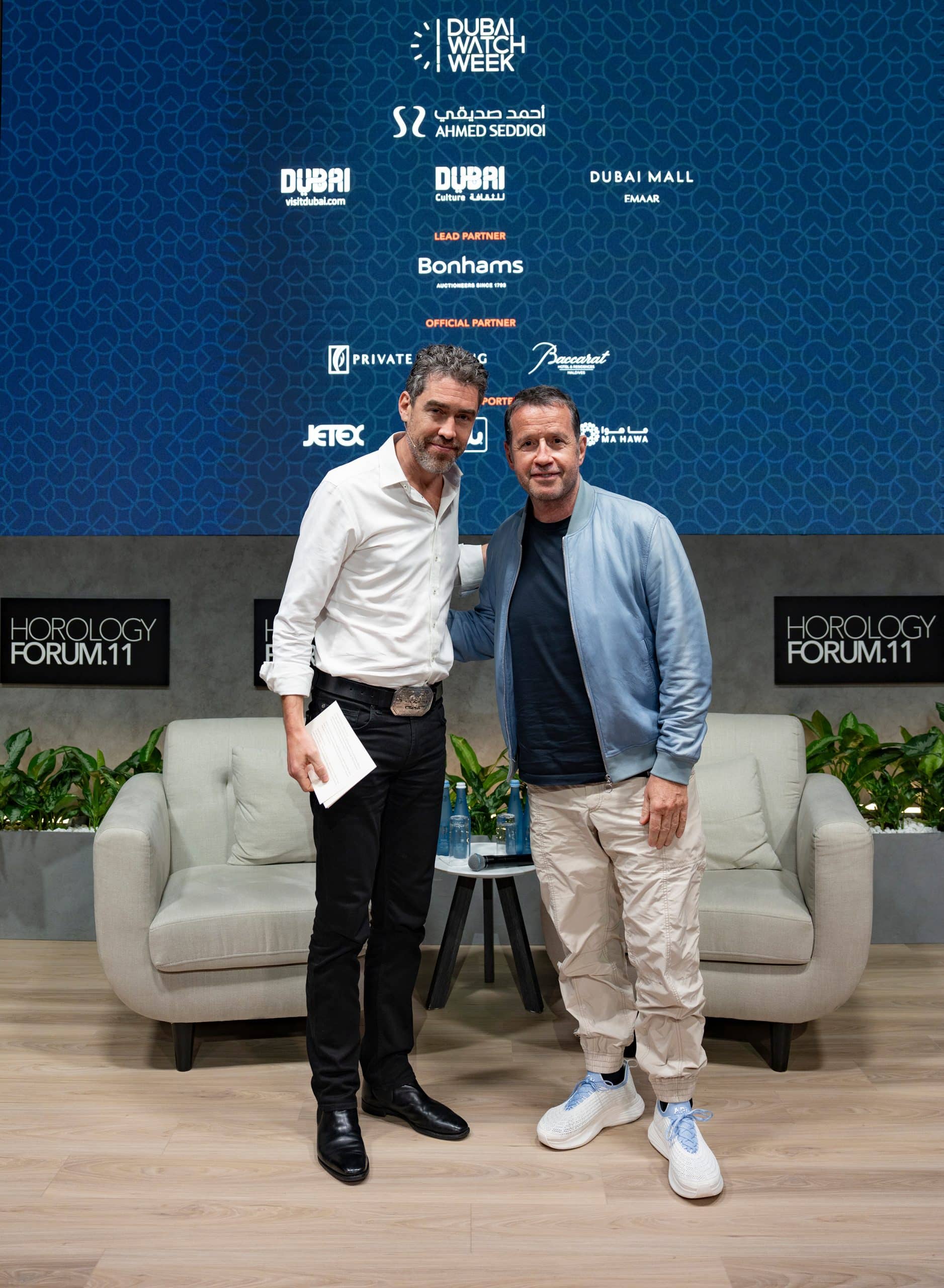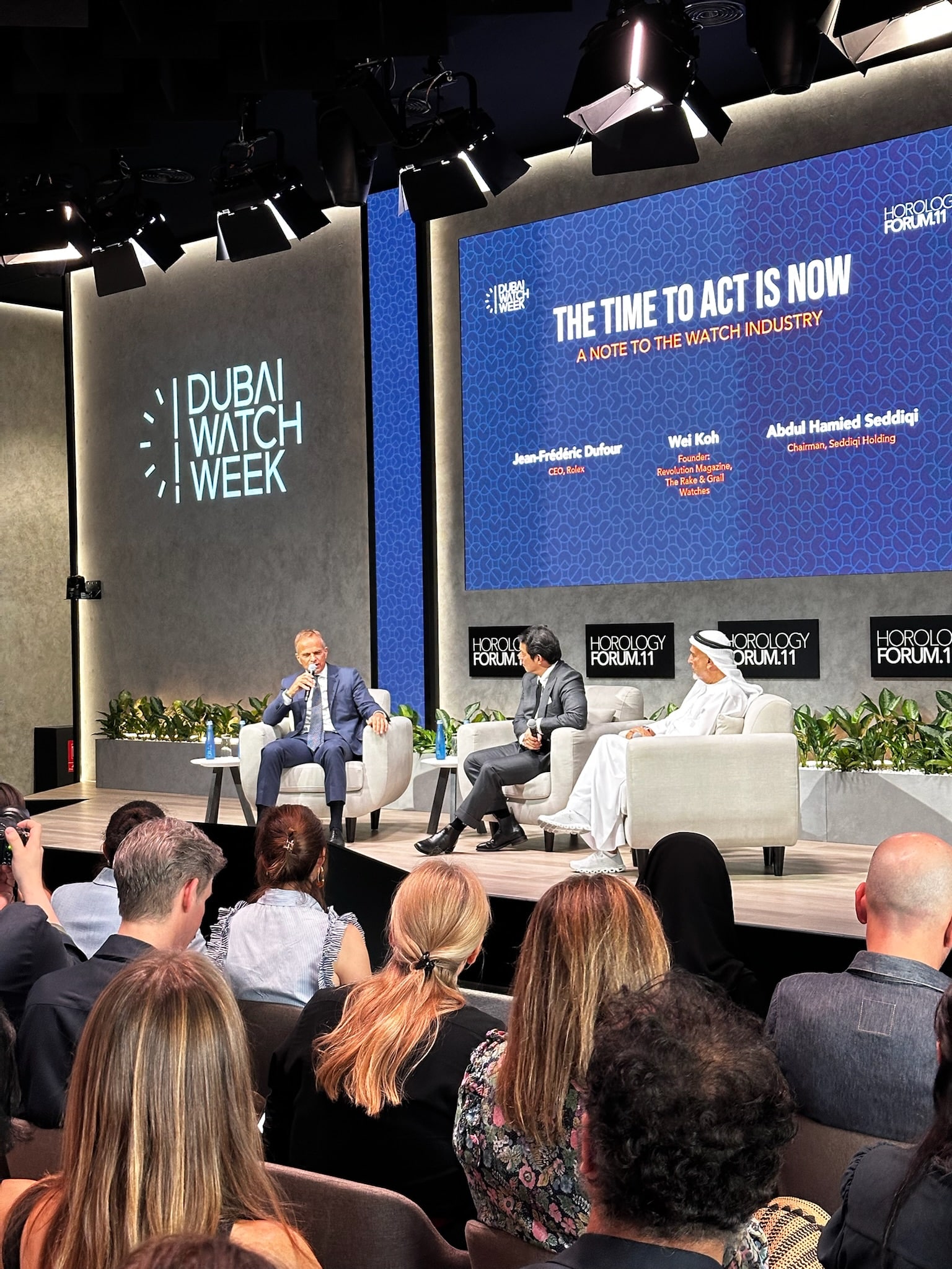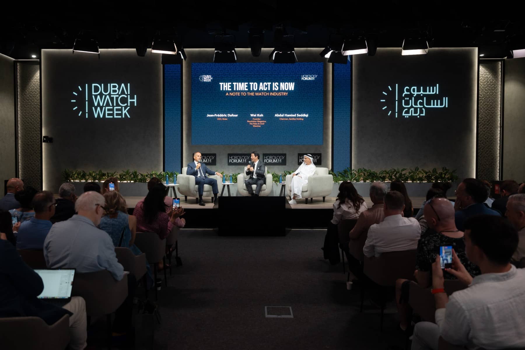 Si había dudas de qué representa DWW en el ecosistema global relojero, Jean-Frédéric Dufour la disipó el primer día. El CEO de Rolex, notoriamente reticente a apariciones públicas, protagonizó la conversación inaugural junto a Abdul Hamied Seddiqi, presidente de Seddiqi Holding, moderada por Wei Koh de Revolution. La sala estaba abarrotada porque cuando el CEO de Rolex elige un evento para hablar, ese evento importa. Dufour habló durante 45 minutos con una franqueza inusual, revelando detalles operativos que Rolex tradicionalmente guarda celosamente: 1,900 relojeros dedicados exclusivamente a servicio postventa; más de 2,000 ingenieros; 85 doctores en investigación y desarrollo; 500 aprendices en 26 disciplinas diferentes, una inversión anual de 100 millones de francos en renovación de maquinaria para mantener una edad promedio de equipamiento de apenas ocho años.