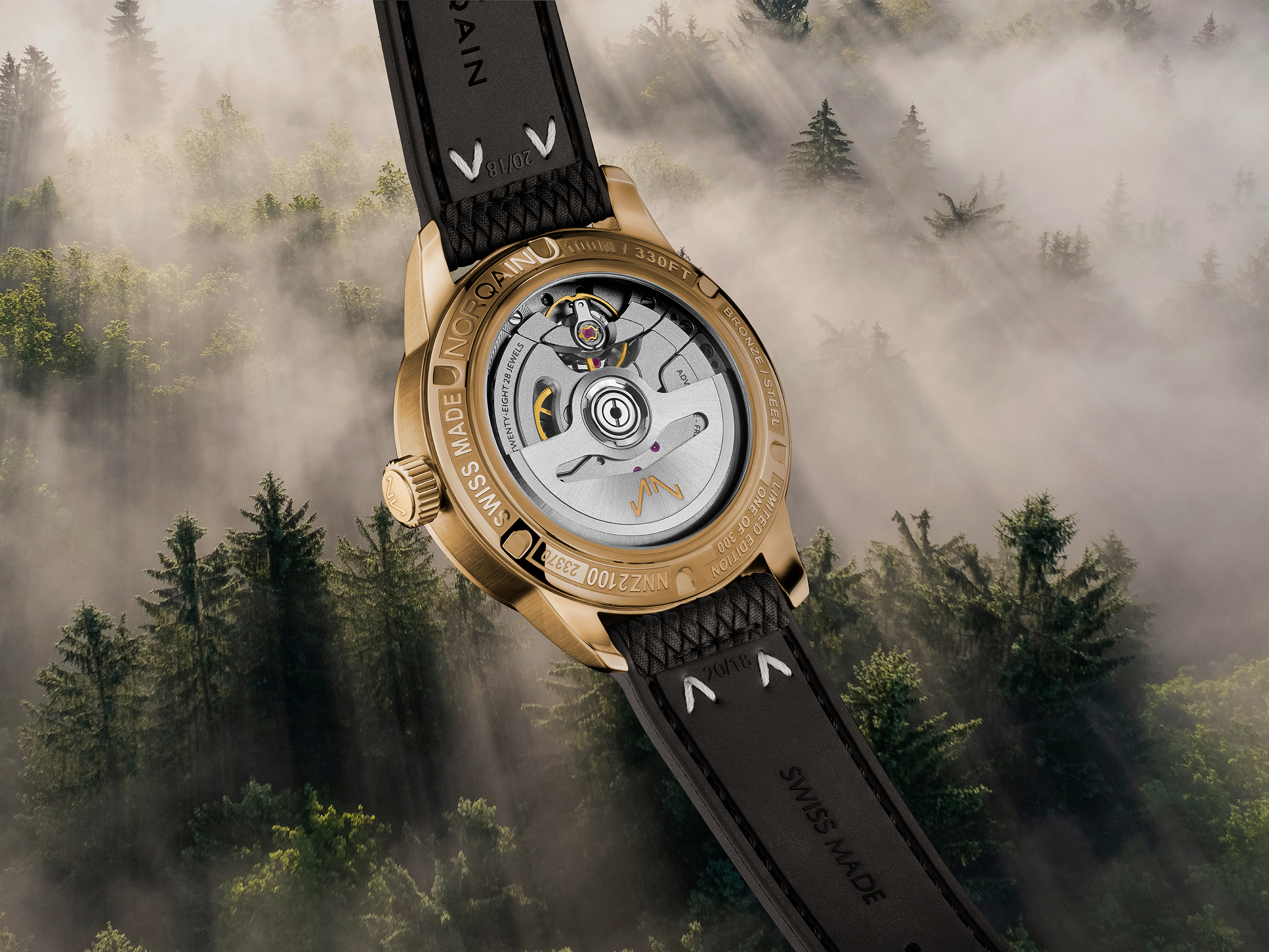 - Caja: Bronce pulido con acabado satinado en la parte superior, fondo de acero inoxidable con revestimiento PVD de bronce, 40 mm, sumergible 1 00 m, cristal de zafiro tipo caja, fondo transparente con el grabado “LIMITED EDITION ONE OF 300”, corona atornillada con logotipo NORQAIN, placa NORQAIN de bronce grabada y con acabado satinado en el lado izquierdo de la caja.