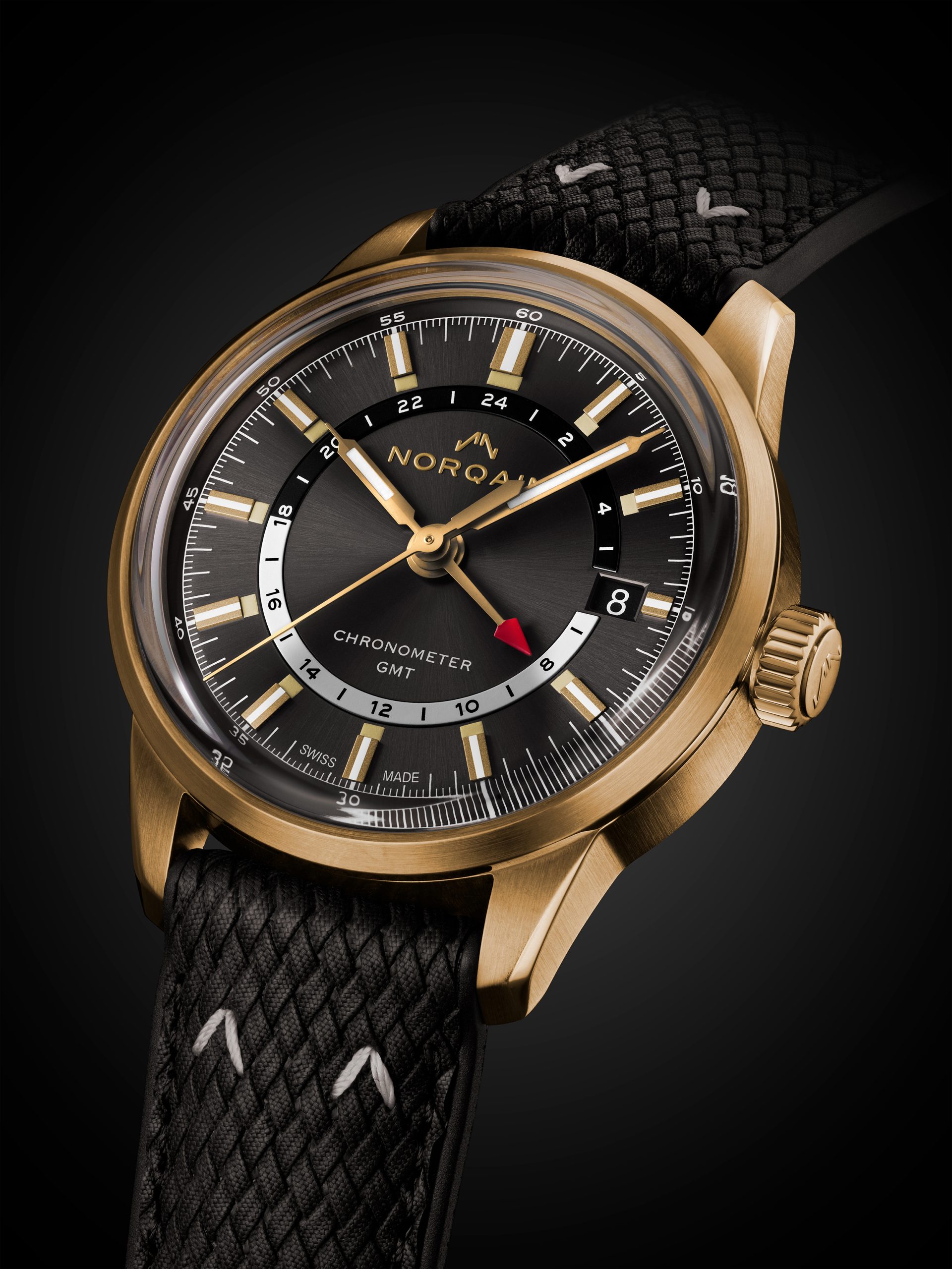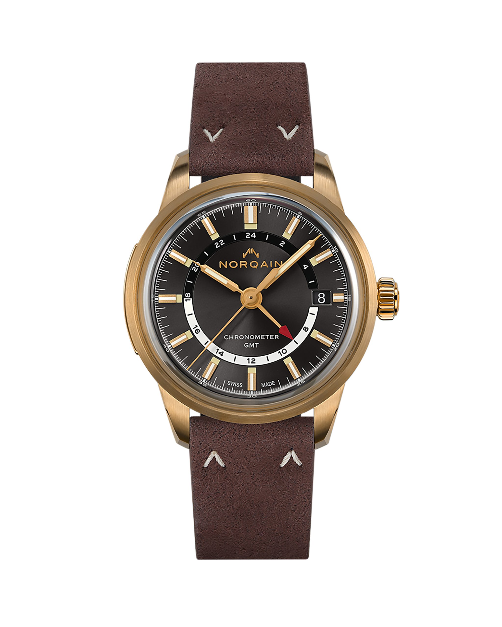 El recién lanzado Freedom 60 GMT en bronce luce una esfera gris antracita, perfectamente en sintonía con el cálido resplandor del bronce. En su interior, los marcadores horarios aplicados y las manecillas de estilo jeringa están rellenos de SuperlumiNova con efecto radio antiguo, asegurando una legibilidad excepcional en cualquier condición de luz.