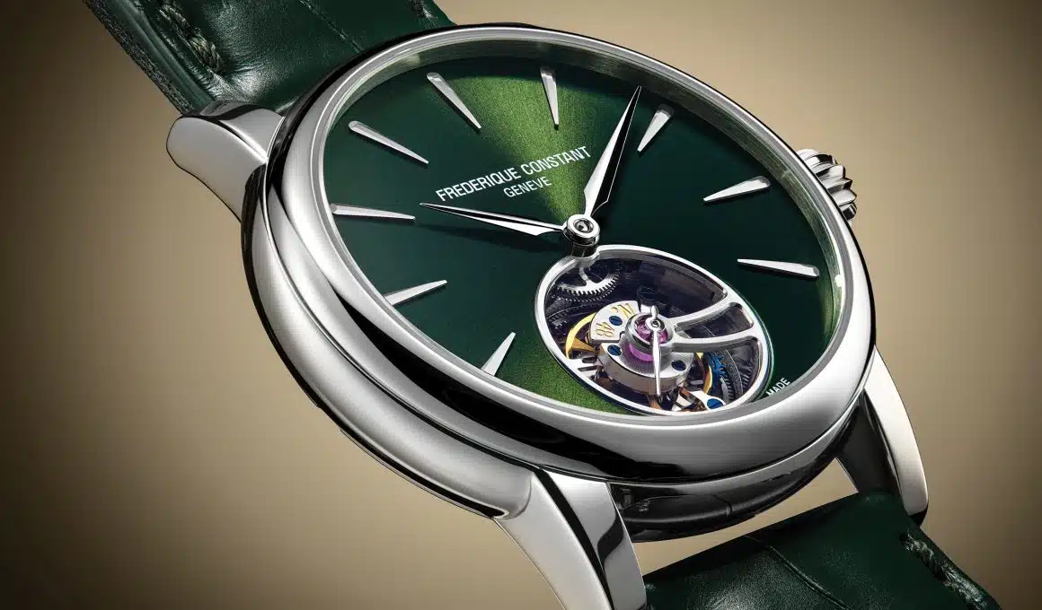 Frederique Constant apuesta por una caja de acero y una llamativa esfera verde para alojar un tourbillon de alta gama a precio muy asequible.