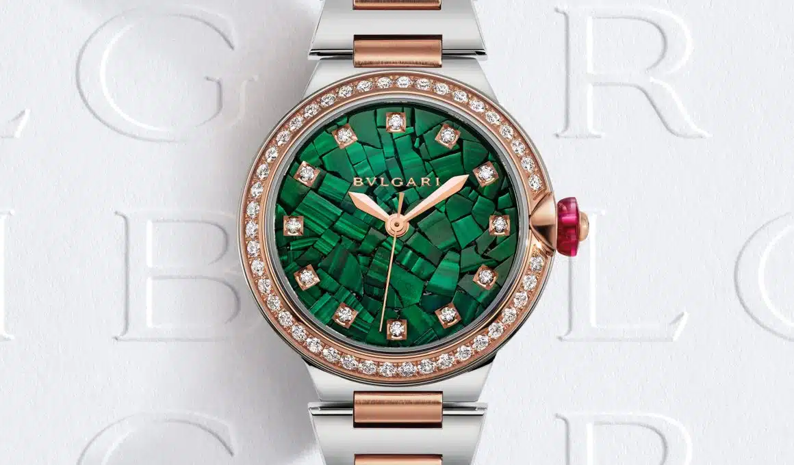 Lucea cumple diez años y se viste de malaquita reciclada y madreperla. Su caja y brazalete evolucionan con líneas más refinadas. Feminidad exquisita