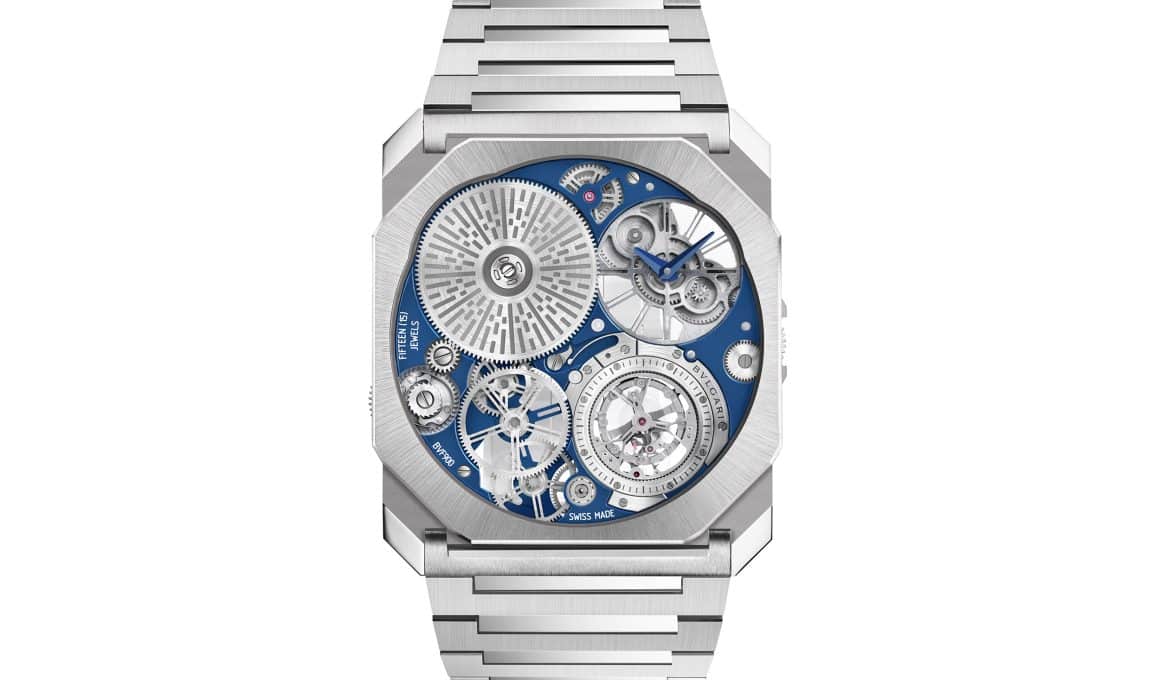 El tourbillon con récord ultradelgado de Bvlgari se viste de platino. Las manecillas y los índices son esqueletados.