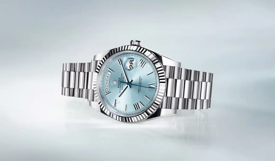El Day-Date es el reloj más exclusivo de Rolex, mucho más en su versión platino. Los modelos fabricados en este material incorporan por primera vez el característico bisel estriado de la firma.