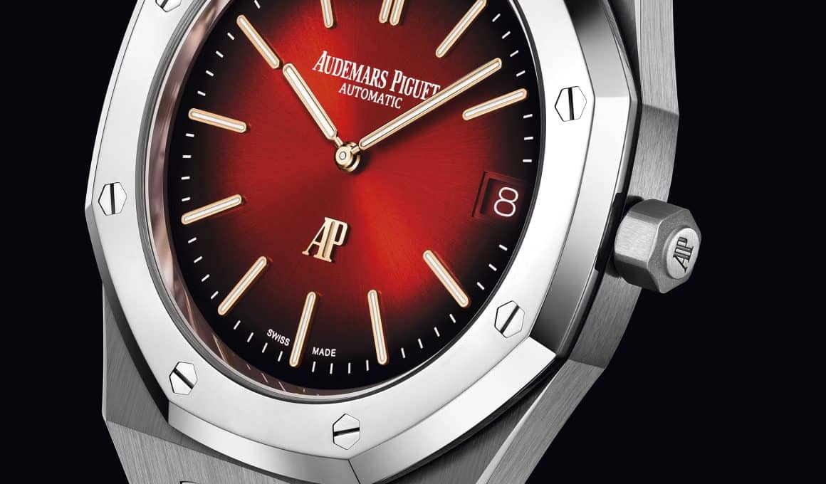 Audemars Piguet presenta una nueva versión de su mítico Royal Oak Jumbo Extraplano con BMG, un material nunca usado comercialmente y acompañado de una original carátula en burdeos.