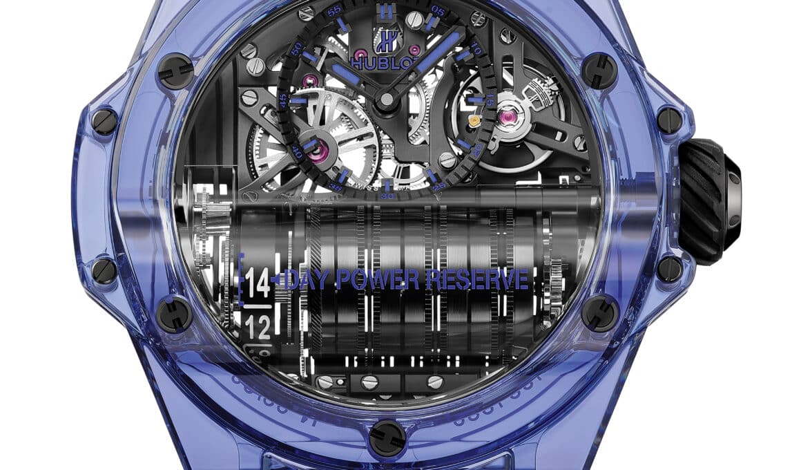 Hasta dos semanas enteras puede funcionar el Hublot MP-11 sin necesidad de darle cuerda. Esta compleja obra de ingeniería relojera está ahora disponible con caja de zafiro azul.