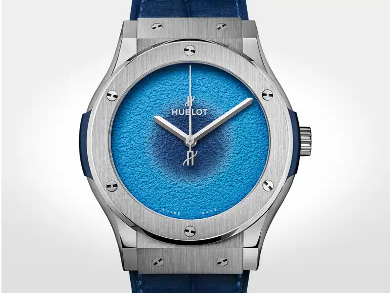 El reloj para caballero cuenta con caja de titanio pulido y acabados satinados, cristal de zafiro con tratamiento anti-reflejante, el logo de Hublot y la leyenda “Swiss Made” impresos, manecillas plateadas rodiadas, 42 horas de reserva de marcha, correa de piel aligator azul con caucho en el mismo color y movimiento automático calibre Hublot HUB1112.