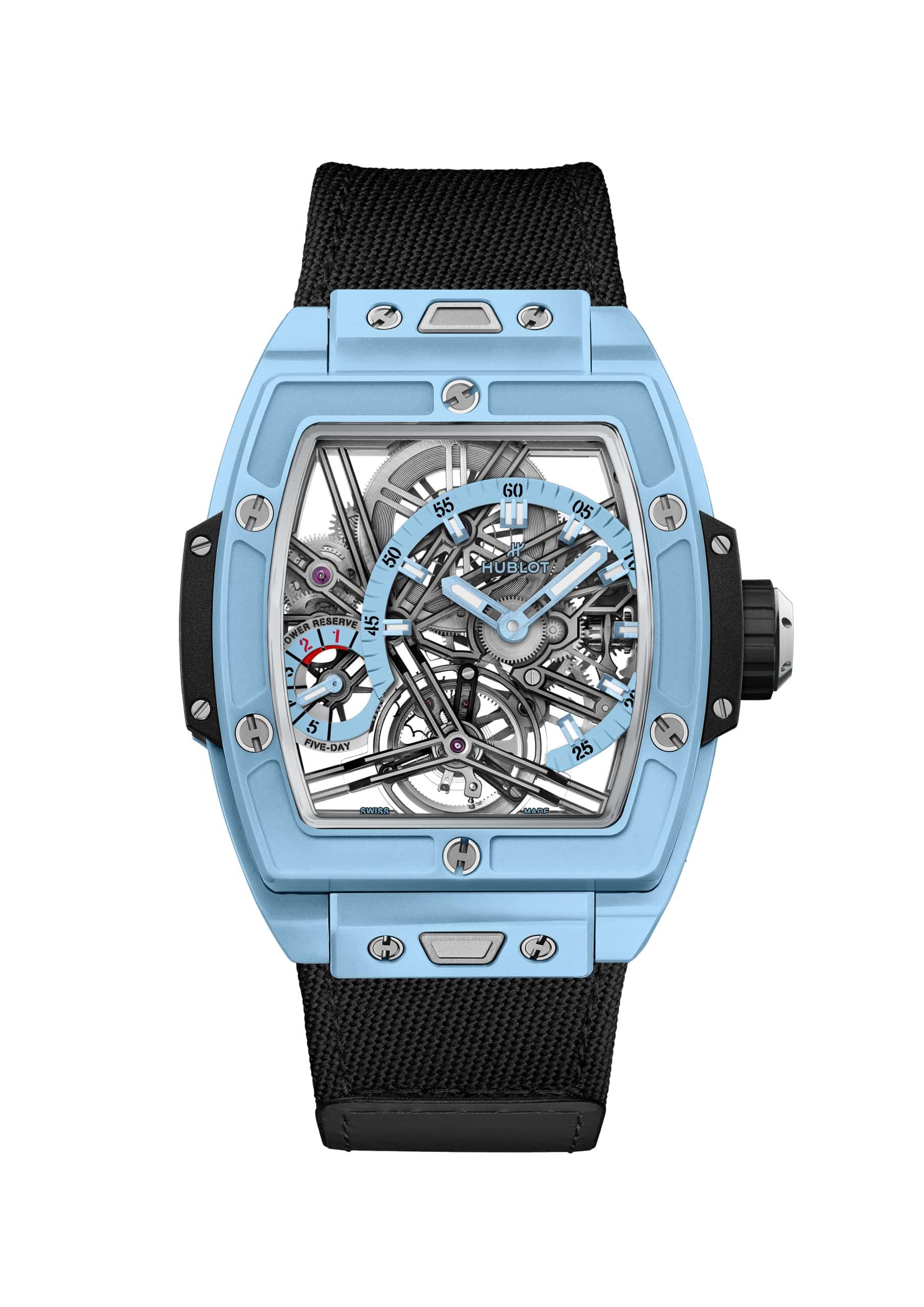 Los nuevos Spirit of Big Bang irrumpen con la característica caja de cerámica en forma de tonel, pero su novedad radica precisamente en el color. Si bien en el pasado ya se había incorporado la cerámica en esta colección de Hublot —un material atractivo, entre otras cosas, por su alta resistencia, superior a la del acero y el titanio—, la colección no había ido más allá de la cerámica blanca. ¿La razón? Lograr otros colores supone un desafío técnico considerable, pues el proceso de sinterización del circonio requiere alcanzar temperaturas extremas.