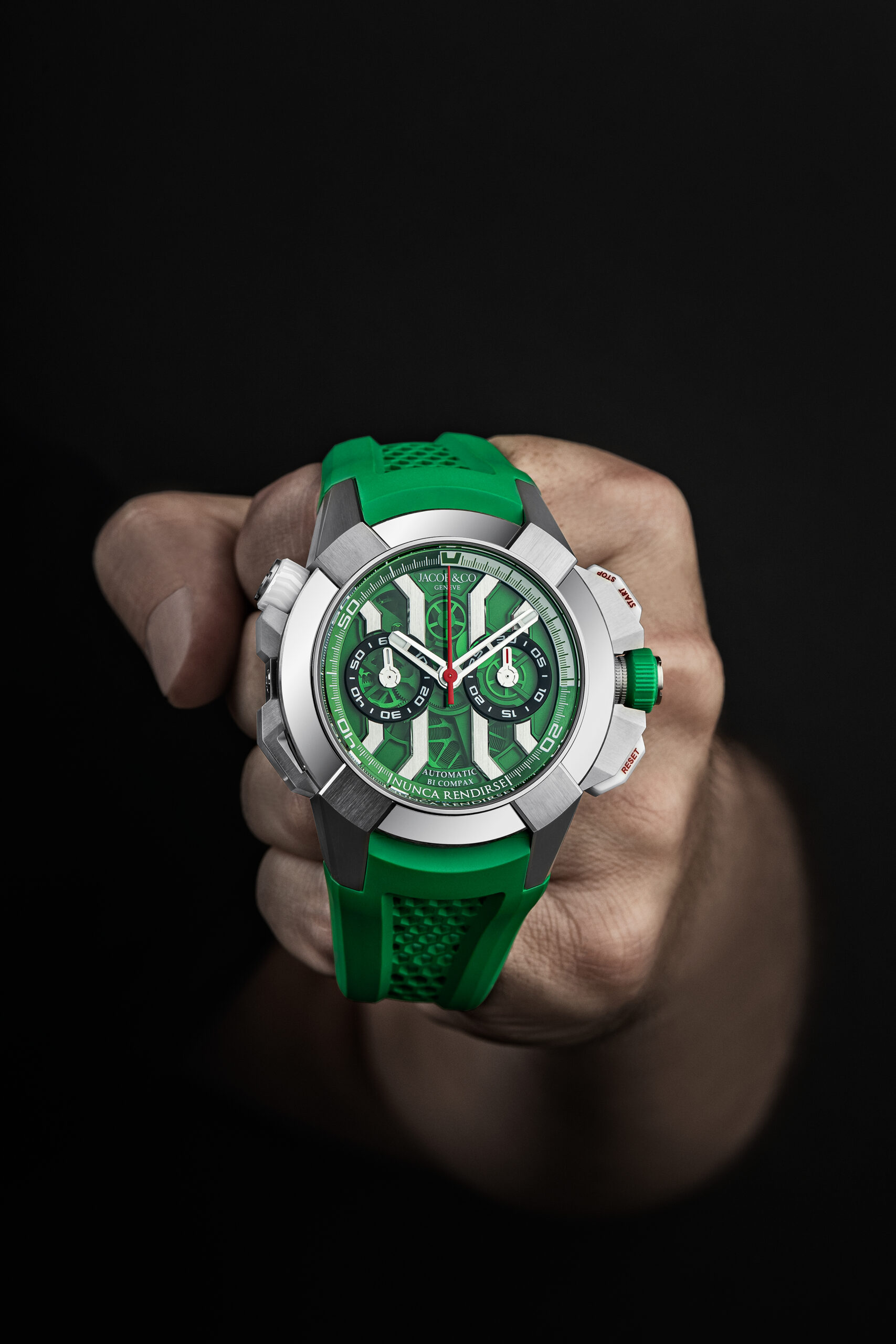 Así nace la nueva colección de Jacob & Co “Nunca Rendirse”. Una serie exclusiva de 10 piezas —cinco en oro y cinco en titanio— que conectan con el alma del mexicano. El cronógrafo por antonomasia de Jacob & Co. presenta, entre otras referencias, declinaciones con tourbillon, dos versiones con diamantes (una con bisel de cerámica) y también una pieza con diamantes baguette.
