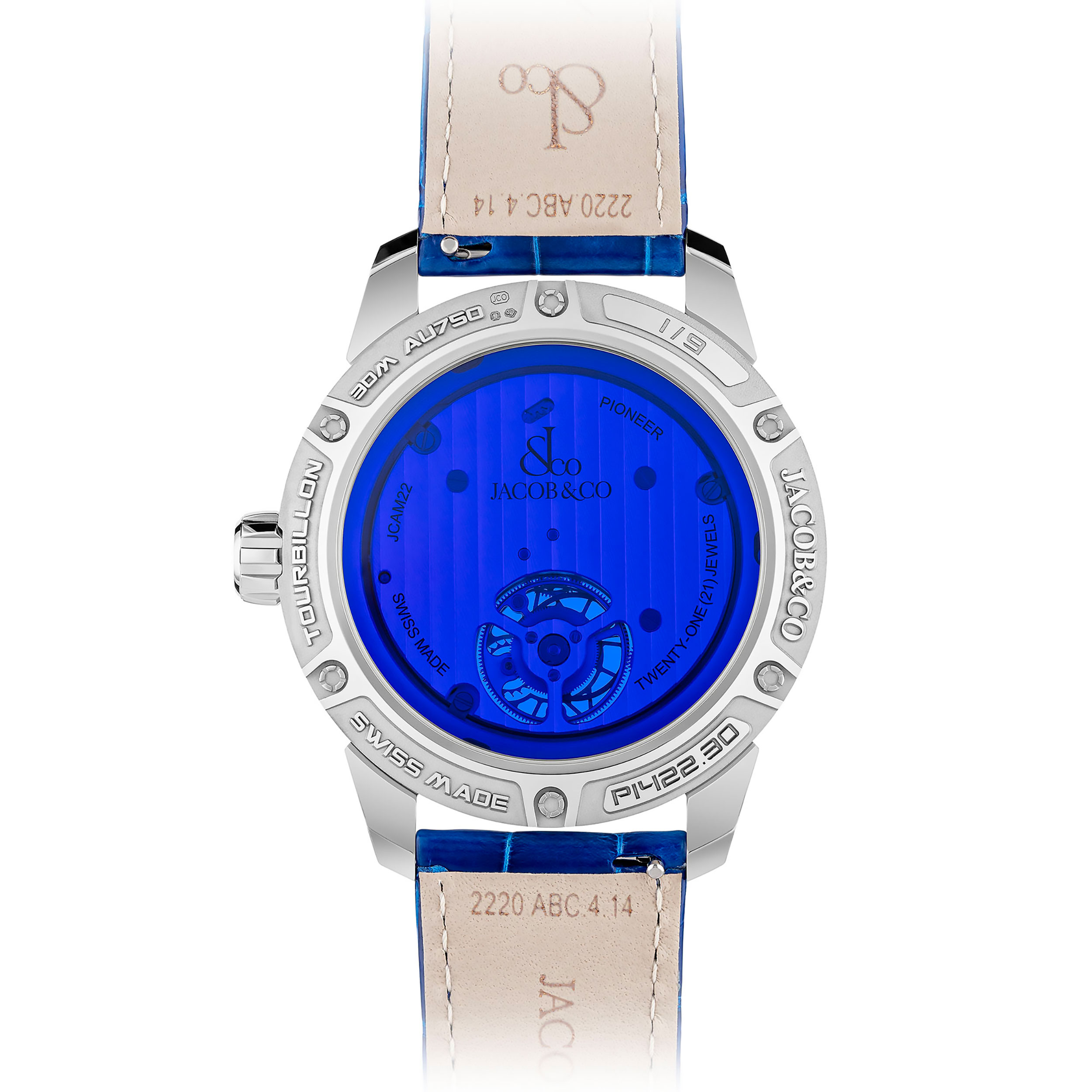 - Movimiento: Manual, calibre JCAM22, tourbillon volante de un minuto, 176 componentes, 60 horas de marcha, 28.800 alt/h, 21 rubíes.