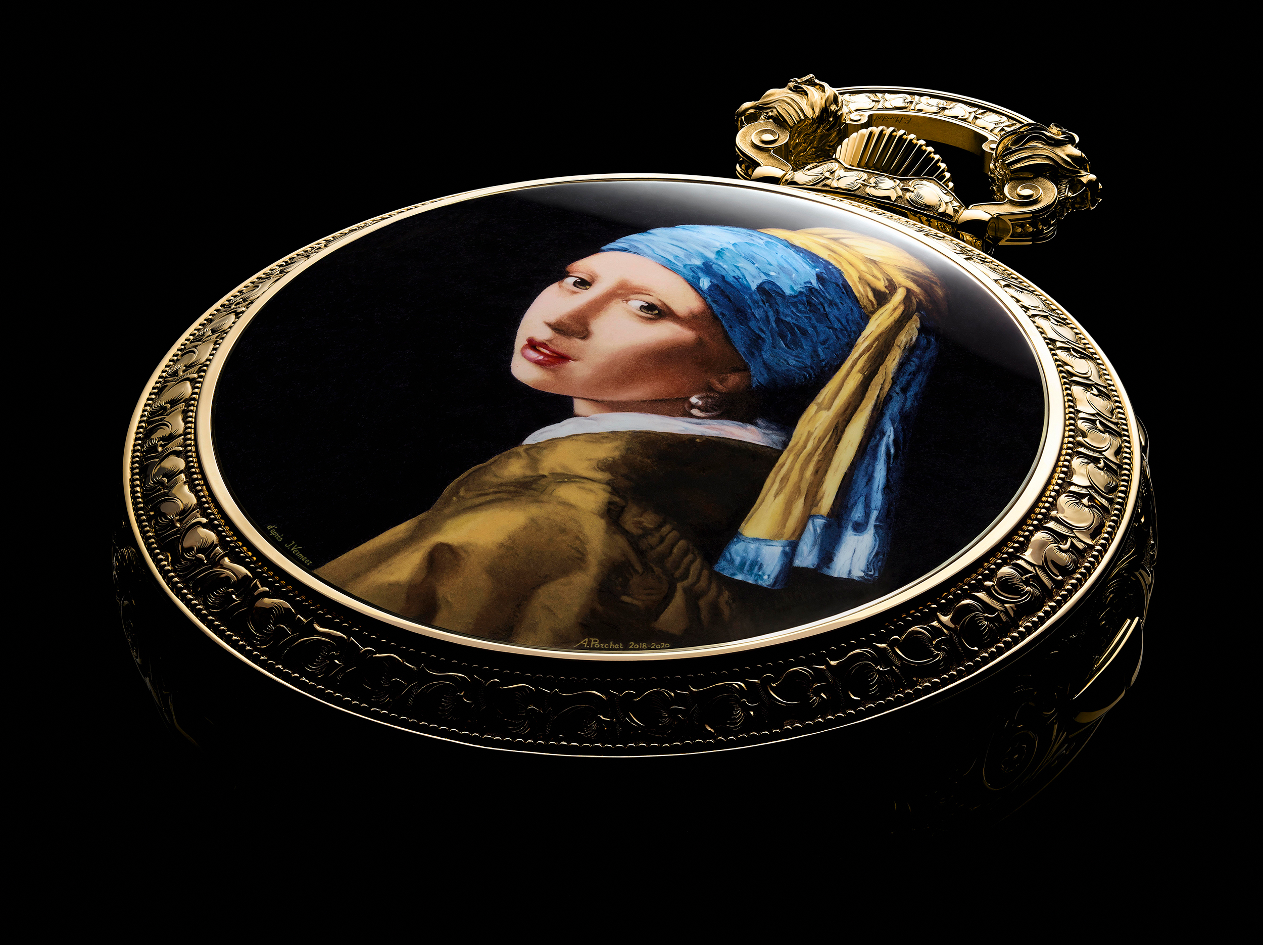 Vacheron Constantin ha realizado un reloj de bolsillo a gusto de su cliente secreto. Lo único que conocemos de este coleccionista es una afirmación categórica. “La pasión consiste en buscar siempre lo que es, teóricamente, imposible de obtener. Y la maison de Ginebra se ha puesto manos a la obra para satisfacerlo. Un nuevo movimiento Gran Sonería Westminster con tourbillon —calibre 3761— en una caja decorada artesanalmente de forma minuciosa. Cuenta con una tapa (tipo officier) cuya pintura a esmalte reproduce el óleo “La Joven de la perla” de Johannes Vermeer. Un trabajo manual realizado por Anita Porchet.