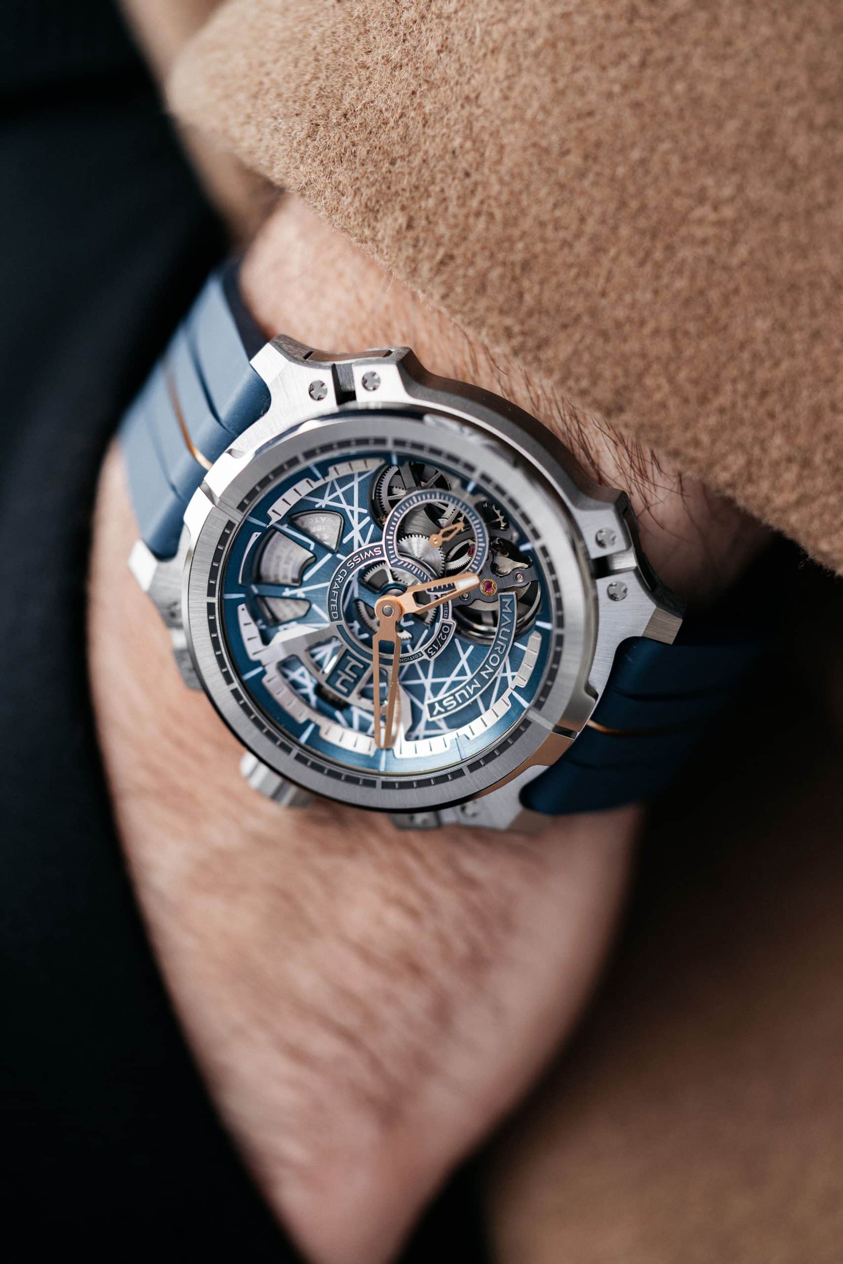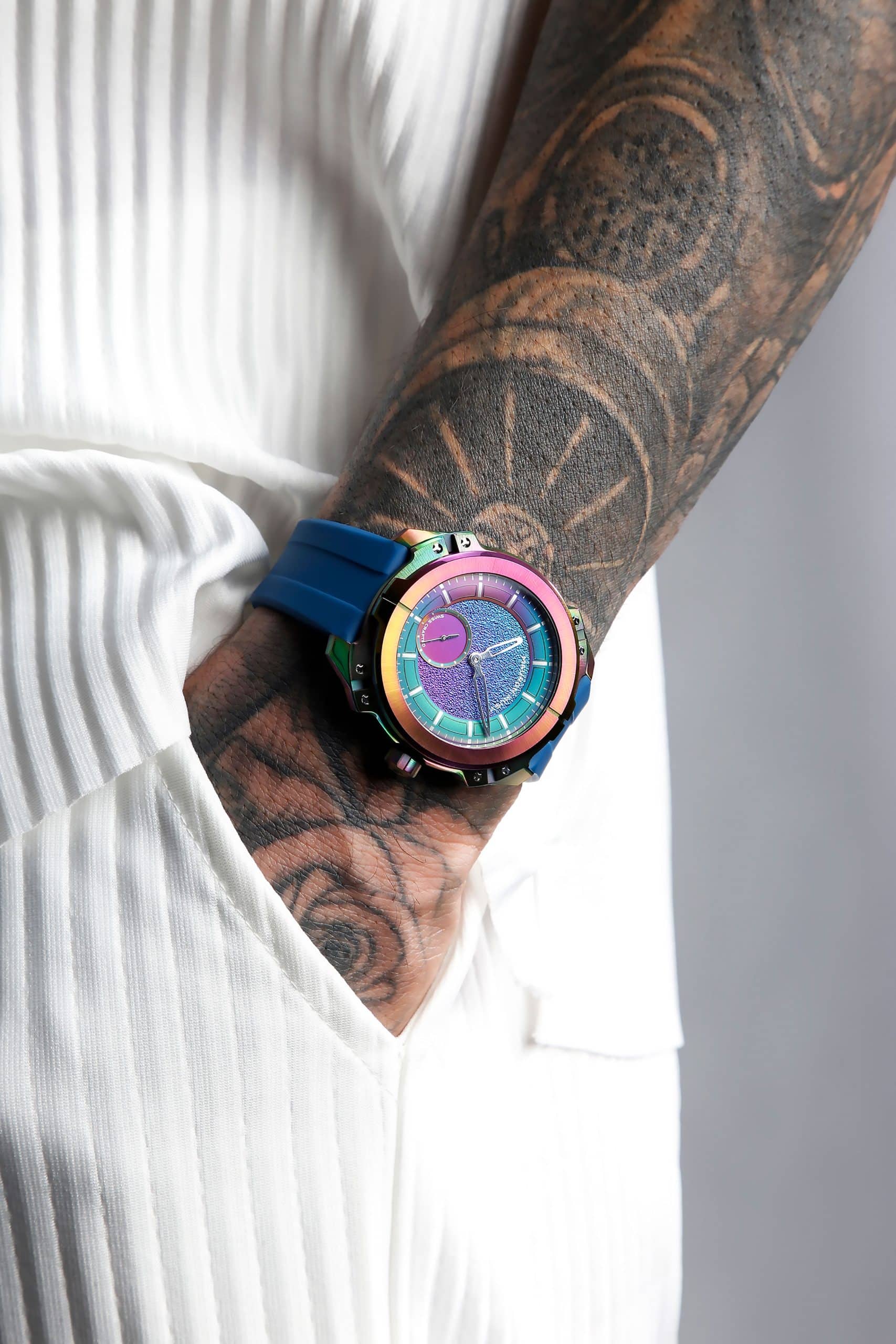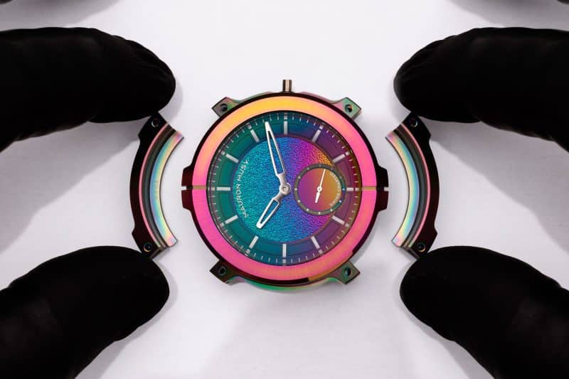 Arriba, el MU06-921 Mayura, uno de los relojes más espectaculares hechos por Mauron Musy hasta la fecha, gracias al recubrimiento irisado de su caja de titanio.