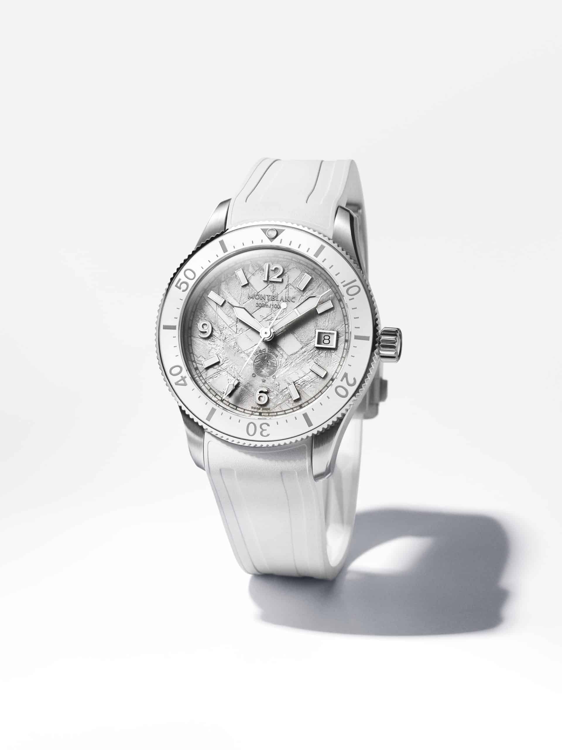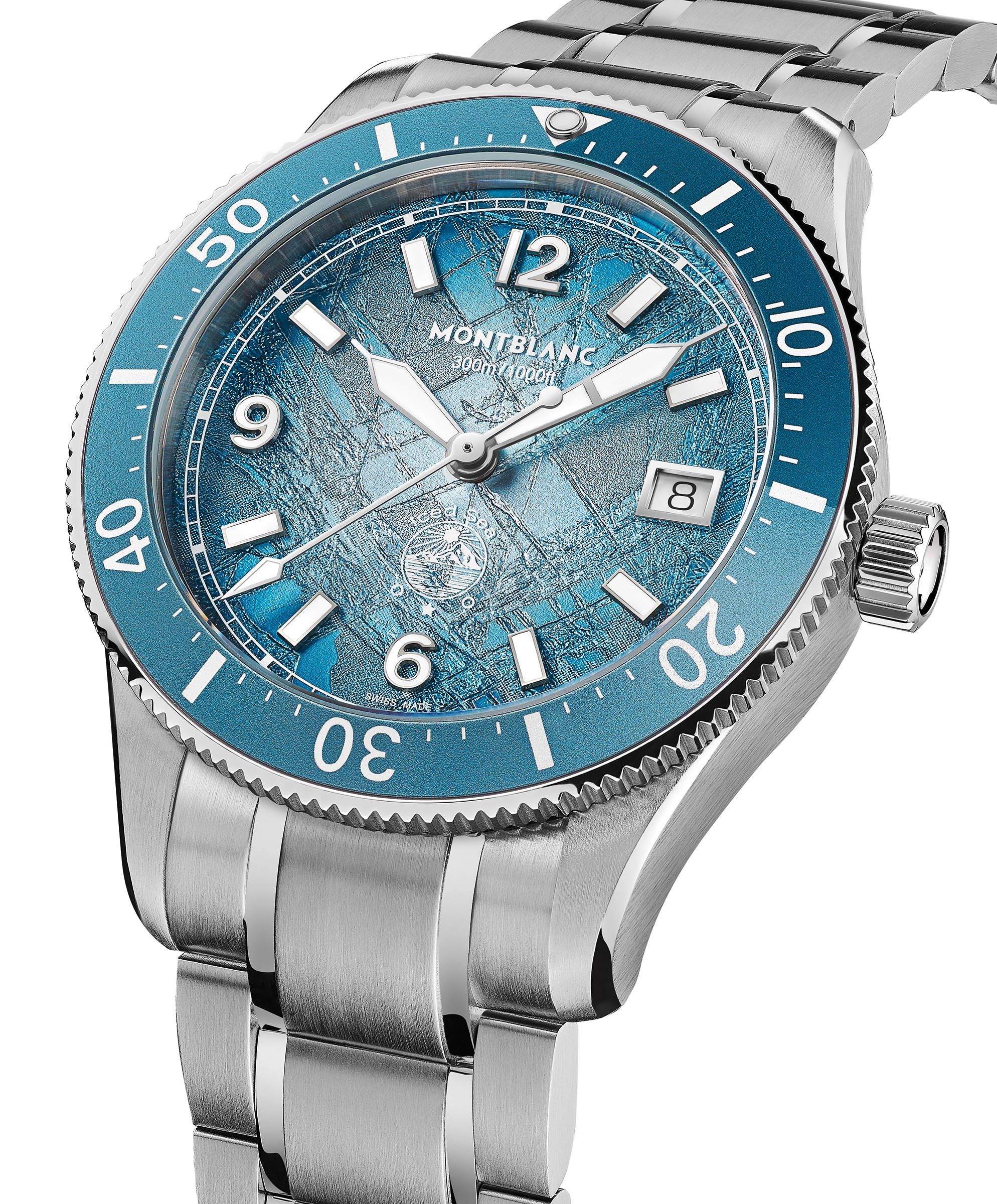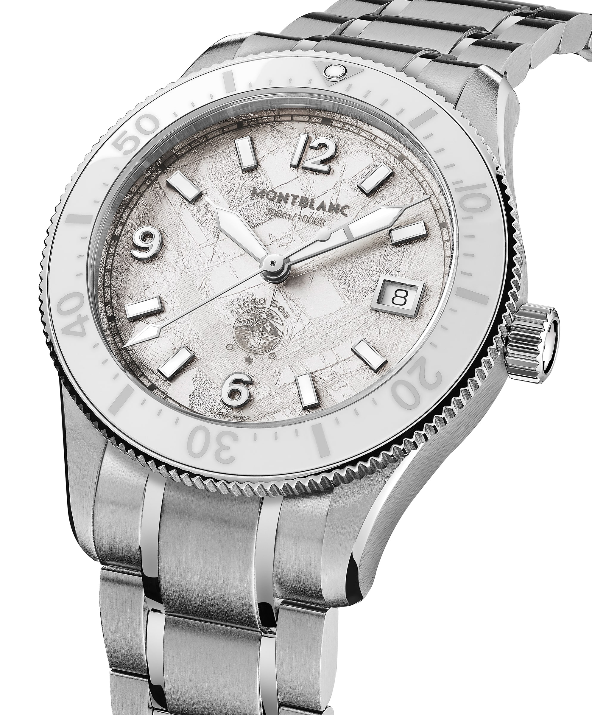 Esas cualidades están presentes en el segundo Iced Sea Automatic Date 0 Oxygen 38 mm, una propuesta bastante audaz —y genial, hay que decirlo— por su look blanco. Aunque parezca sorprendente, es la primera vez que la marca crea un Iced Sea con una carátula en color blanco puro. Igual que su hermano, está disponible con un brazalete de acero o una correa de caucho. En este caso, el bisel tiene un inserto de cerámica blanca. Ambos modelos están equipados con el movimiento automático MB 24.17 de Montblanc, que ofrece una reserva de marcha de 38 horas e impulsa una función de fecha a las 3 horas. En el fondo tienen un grabado 3D que muestra un glaciar y un buzo.