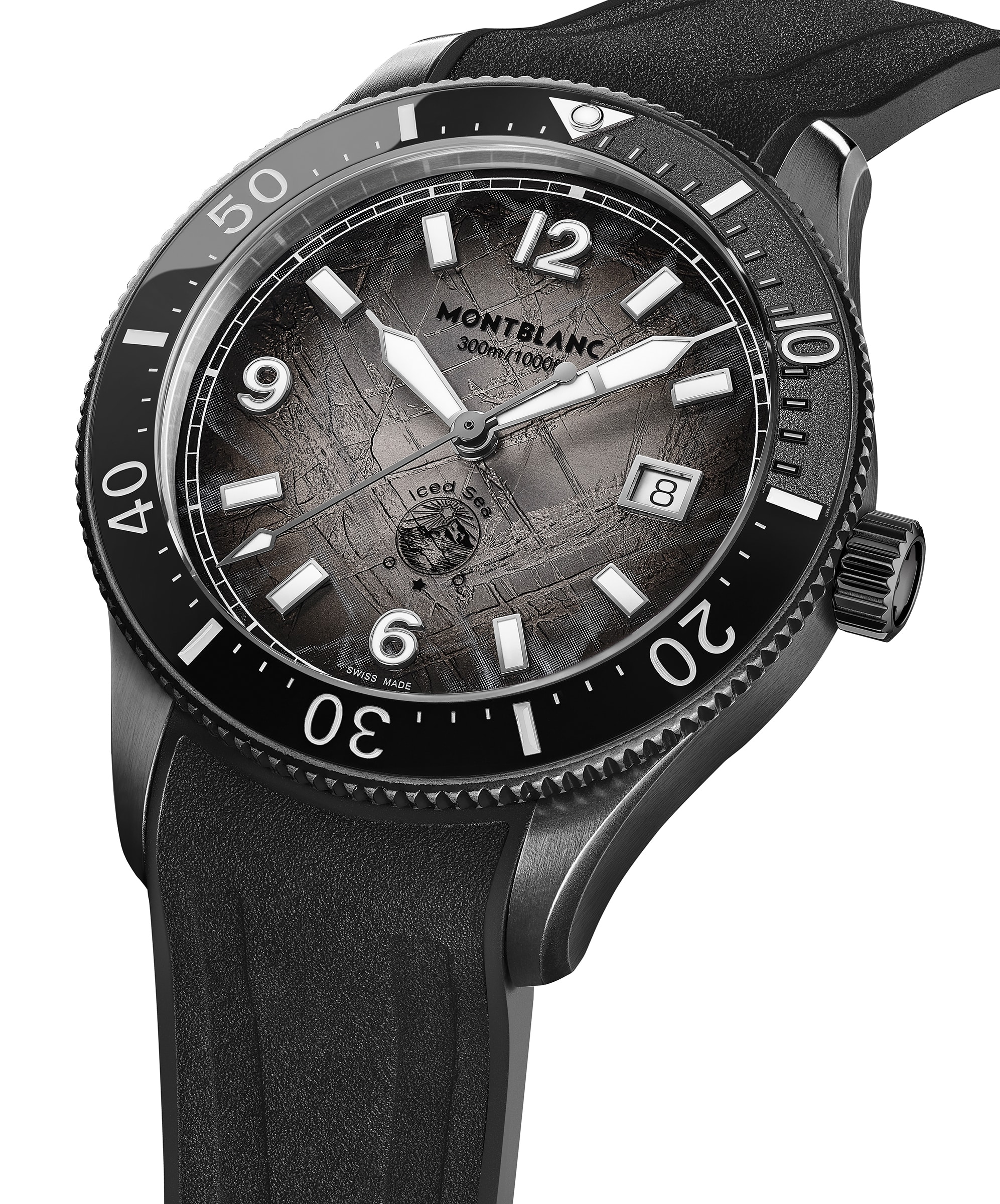 La versatilidad de la línea Iced Sea es uno de sus principales atributos, como esta versión de 41 mm en acero envejecido con revestimiento negro. El acabado se logra con un lavado manual del acero antes de cepillarlo con cuarcita, una roca dura granulada procedente de una cantera del macizo del Mont Blanc. El bisel tiene inserciones de cerámica negra. Además, es sometido a un proceso con láser para darle una textura diferente a los primeros 15 minutos de la escala de inmersión. La esfera luce el motivo de glaciar en gris sfumato. Como todos los modelos Iced Sea a partir de 2025, este reloj cuenta con la tecnología 0 Oxygen.