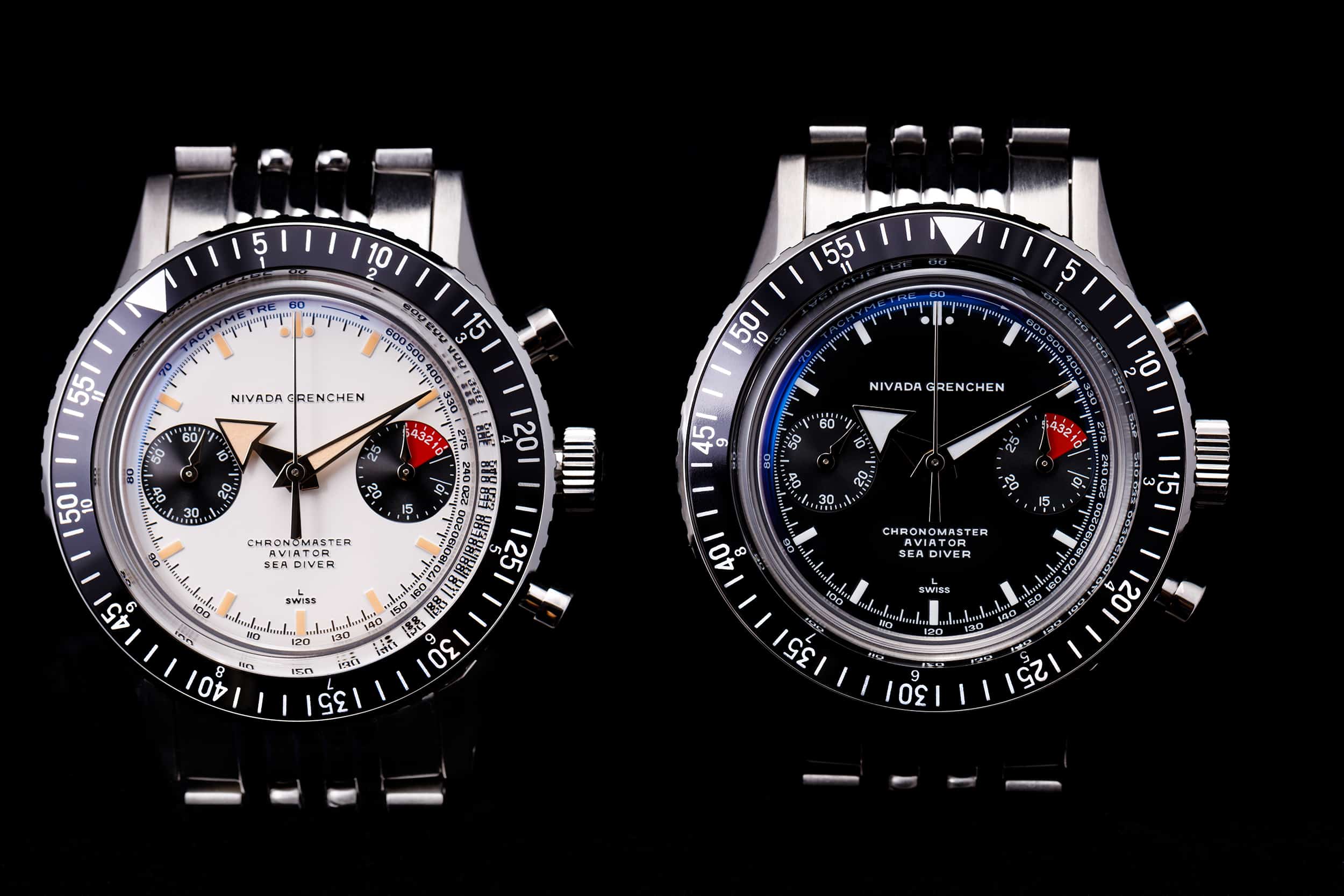Nivada se fundó en Grenchen en 1926 y, desde los años 30, la firma ya ofrecía múltiples modelos de instrumentos realmente profesionales. A diferencia de Nivada, la marca con sede mexicana, el sello completamente nuevo de Nivada Grenchen es un proyecto que tomó varios años para rescatar el legado originario en Suiza. El Chronomaster fue el cronógrafo más completo de los años 60 y 70. En su carátula lucen los apellidos Aviator Sea Diver. Una pieza que fue comparada a una “computadora de muñeca” gracias a su multifuncionalidad. Y el reloj no pasó desapercibido en el mercado norteamericano.