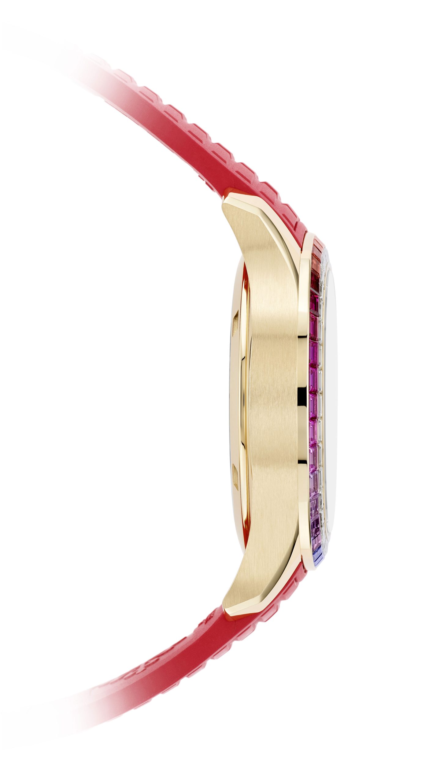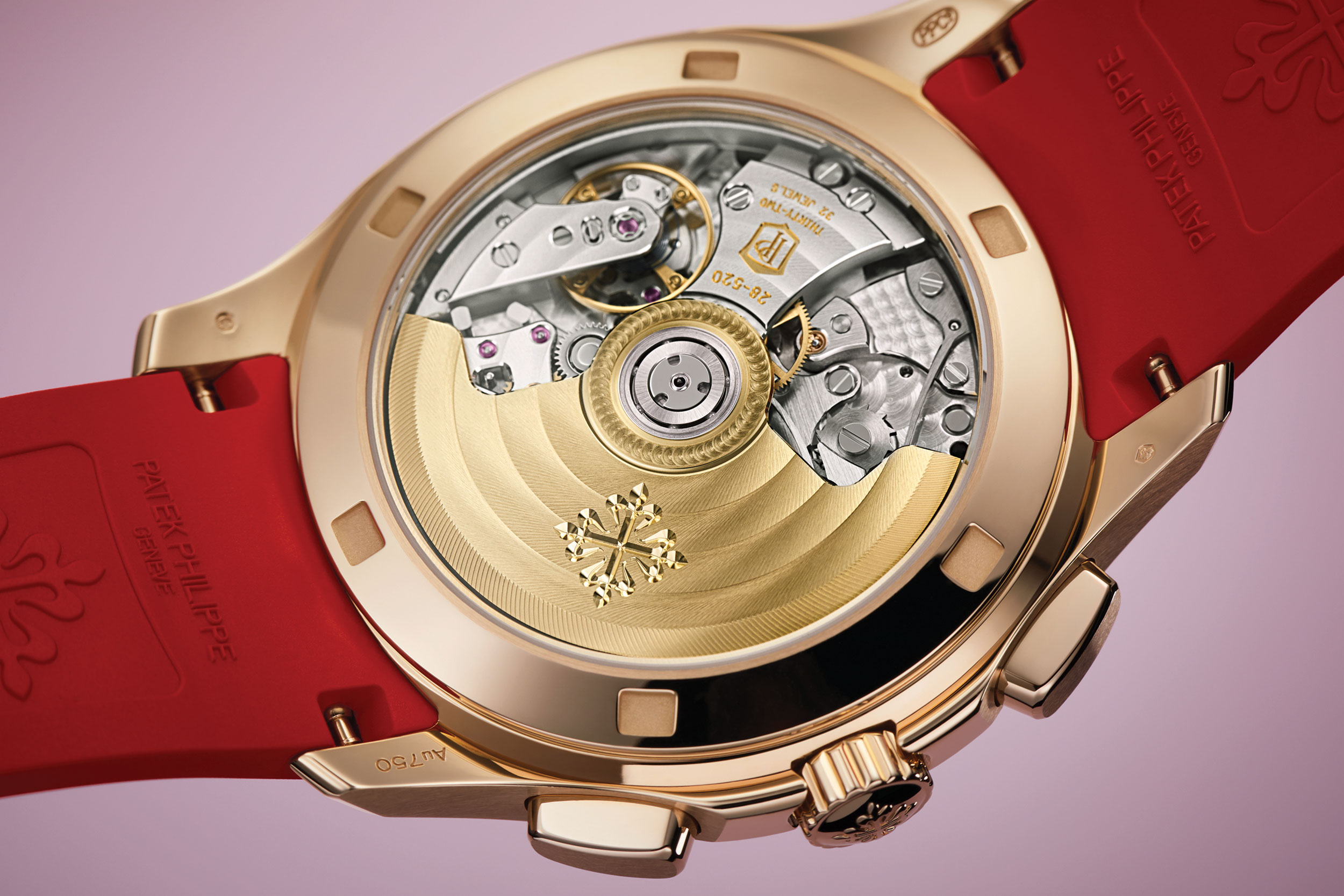 Como genotipo de la nueva referencia 7968/300R encontramos un cronógrafo flyback con embrague vertical. Y como fenotipo una carátula de nácar blanco con el motivo Aquanaut e índices aplicados de oro rosa engastados con 12 zafiros multicolores baguette (0.31 ct) y cifras aplicadas de oro rosa. Patek Phillippe lo presenta como su primer cronógrafo automático femenino. La firma habla de reloj “sport chic contemporáneo” para mujeres modernas y activas. Pero, actualmente, una caja de 39.9 mm de oro rosa dista a la misma equidistancia del placer de un hombre que el de una mujer para portarlo en la muñeca. Esta versión de joyería con bisel engastado con 40 zafiros multicolores de talla baguette (2.31 ct) y 40 diamantes baguette (2.05 ct) es una tentación multicolor a la que puede sucumbir más de un hombre. El reloj viene con tres correas de composite: rojo (así se entrega) y beige mate o blanco mate adicionales.
