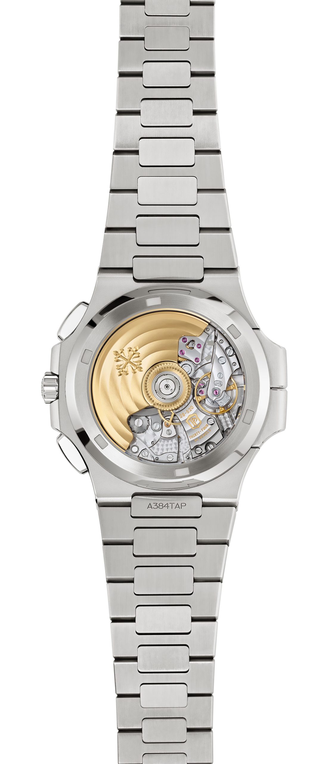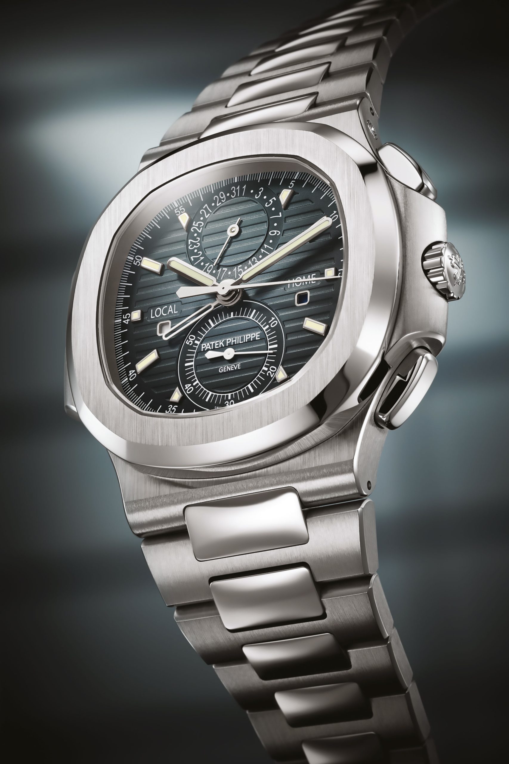 Clásica reedición del Nautilus Cronógrafo Travel Time, uno de los pocos relojes complicados de la firma en acero. Luce carátula azul con motivo soleil radial y degradado en el contorno. La referencia 5990/1A combina cronógrafo flyback con función travel time —como llama Patek a la función GMT— y un indicador de fecha por manecilla (a las 12 h) ajustado a la hora local. La reconocible caja con forma de escotilla diseñada por Gérald Genta juega con un bello contraste de acabados pulidos y satinados en el bisel, pulsadores y brazalete.