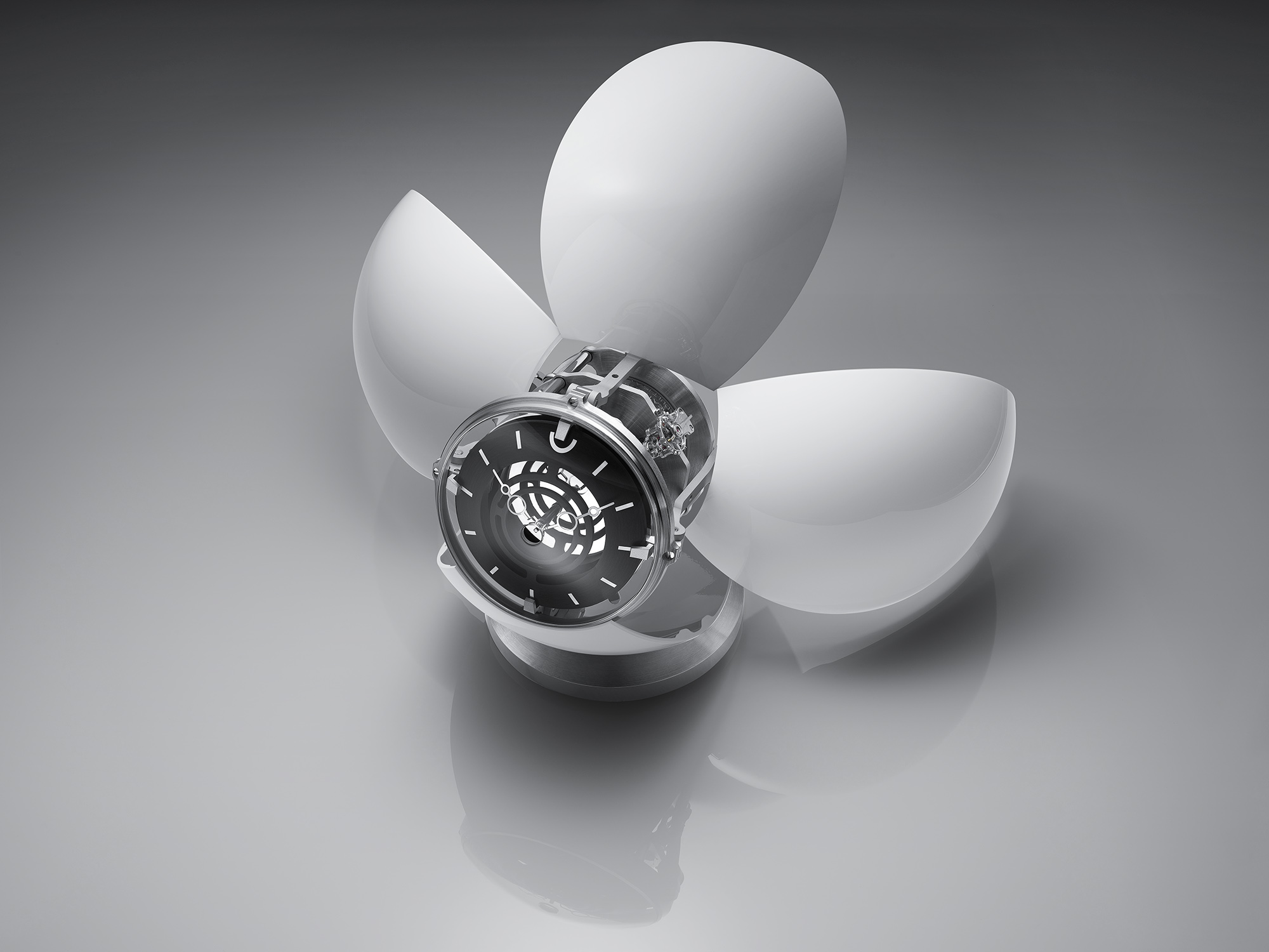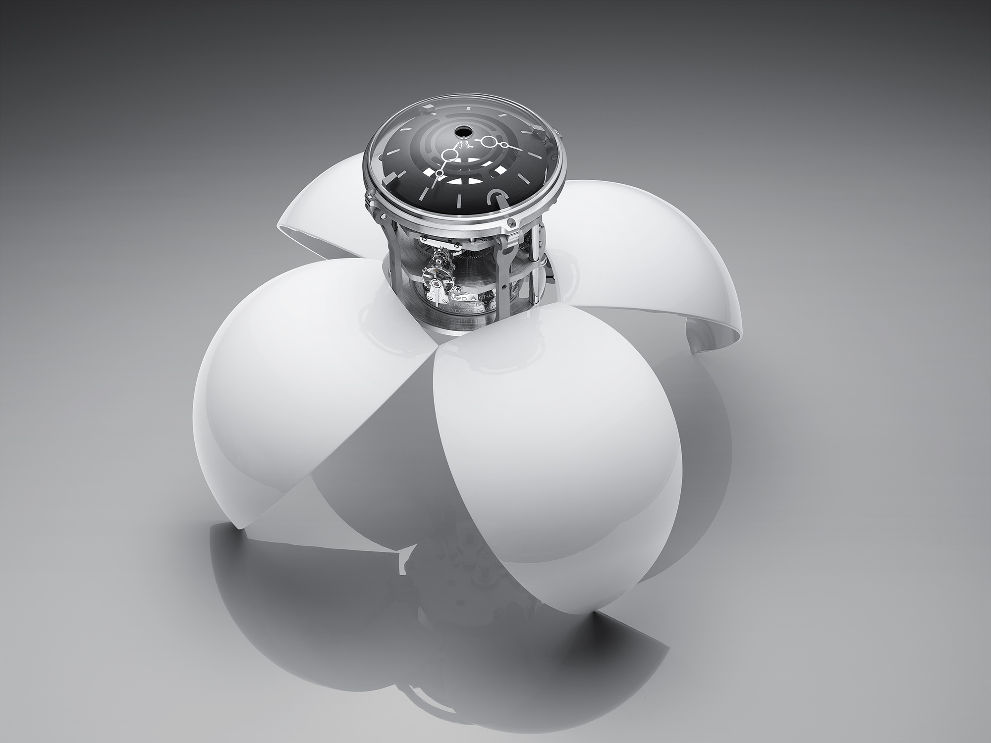 Maertens ha entendido a la perfección el concepto lúdico que esconden todas las referencias de MB&F y lo aplica a MB&F Orb con una estructura movible que permite colocar el reloj de múltiples formas. Se puede poner completamente cerrado sobre el soporte que lo acompaña, inclinado o abierto como si fuera una araña. “Cada cliente es libre de usarlo como quiera. Funciona igual en todas las posiciones”. Para cambiar la imagen del reloj simplemente hay que mover las hojas que protegen el mecanismo. “Están fabricadas en aluminio y sin duda ha sido la más complicado de desarrollar de todo el reloj”, comenta Légeret. Por cierto, el nombre dado por MB&F a estas finas laminas lacadas es élitro, que son las corazas que protegen las alas de ciertos coleópteros como el escarabajo. La inspiración de la naturaleza siempre está presente en las creaciones de la marca.