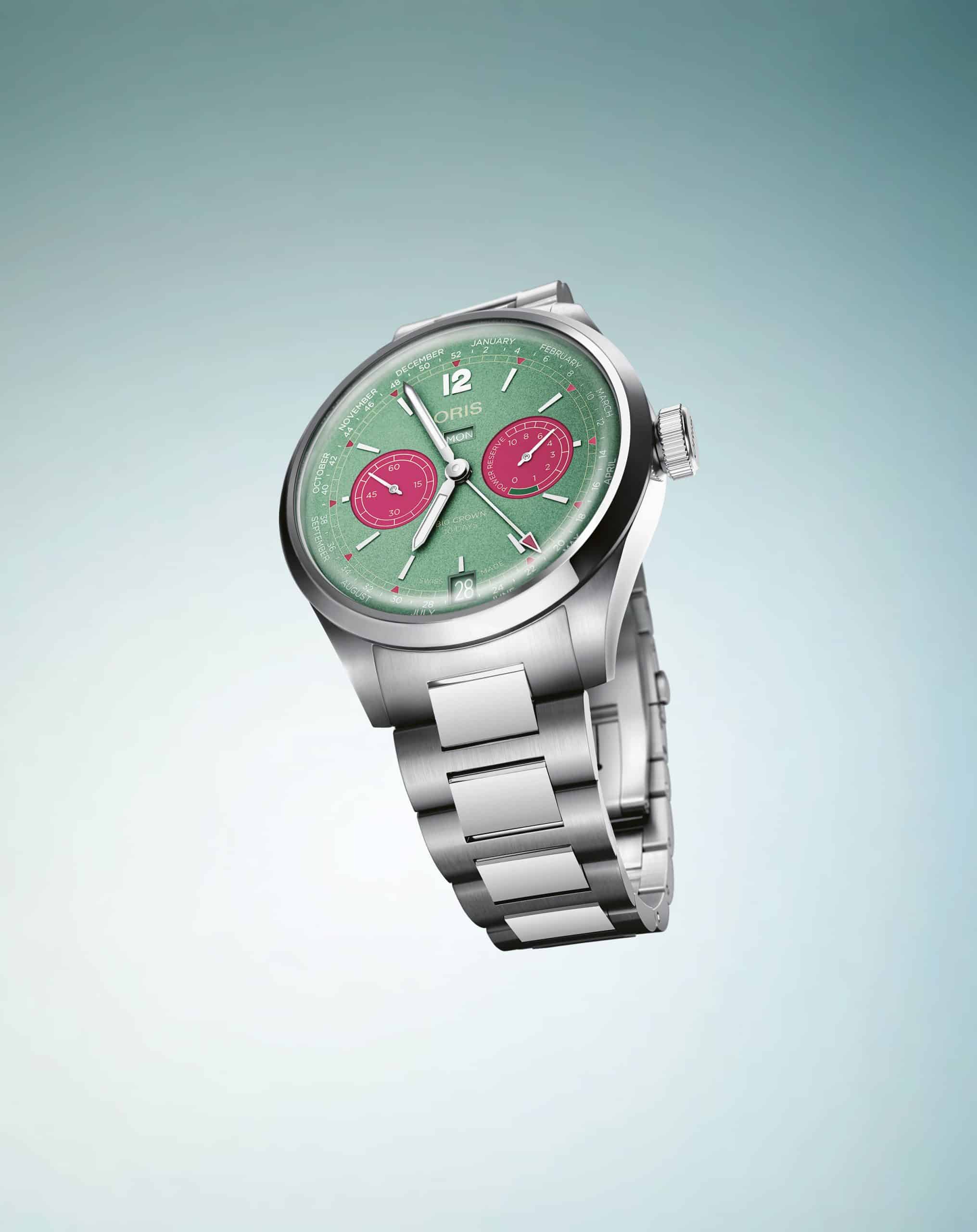 Oris, reconocida por su espíritu audaz, no teme romper moldes. Su enfoque de diseño queda claro al observar creaciones como el ProPilot X Kermit Edition. En esa línea, el renovado Big Crown presenta una caja de 43 mm en acero inoxidable, resistente al agua hasta 50 metros y con una llamativa esfera verde menta con contadores en rosa. La legibilidad permanece intacta gracias a detalles en blanco y dorado, que no solo contrastan con la paleta cromática, sino que facilitan la lectura de elementos clave como la escala de 52 semanas alrededor de la carátula.