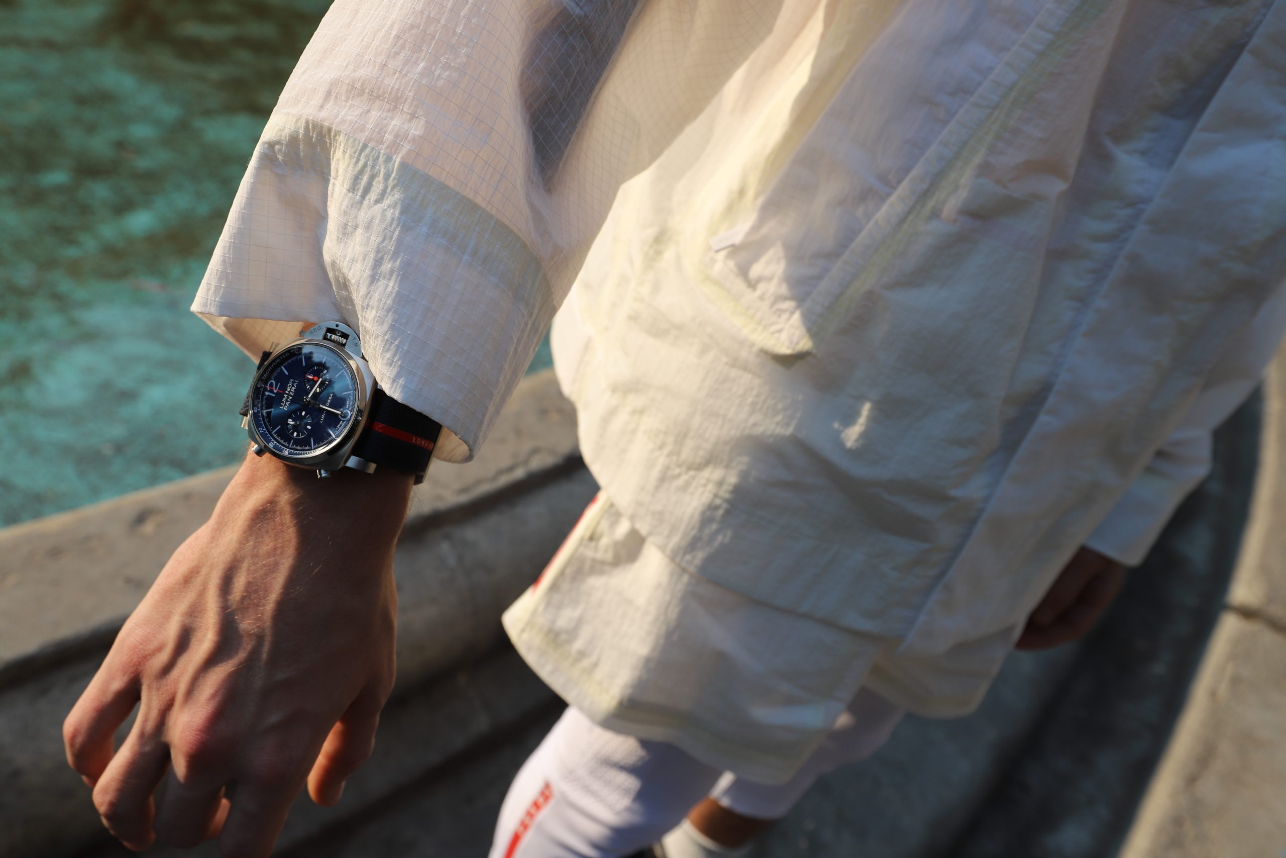Además de ser testigo de este juego de moda y relojes con Panerai y Prada, Nima Local House funcionó como espacio de exhibición para los guardatiempos 2021 que pudimos ver en Watches & Wonders de manera virtual. Por supuesto la experiencia física lo cambia todo. Estaban el Luminor Chrono Goldtech Blu-Notte, el Platinumtech Luminor Marina, el Submersible Blu Notte, el espectacular Submersible Bronzo Blu Abisso, el bien querido Luminor Chrono y, además del Piccolo Due Madreperla, la pieza infaltable para esta ocasión: el Luminor Chrono Luna Rossa.