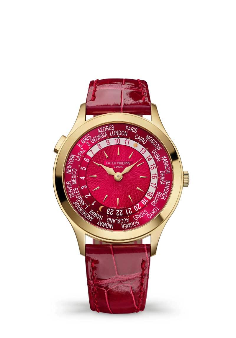 La nueva versión del icónico modelo con 24 husos horarios de Patek Philippe ha decidido omitir los diamantes sobre el bisel y explorar el color rojo carmín en la esfera.