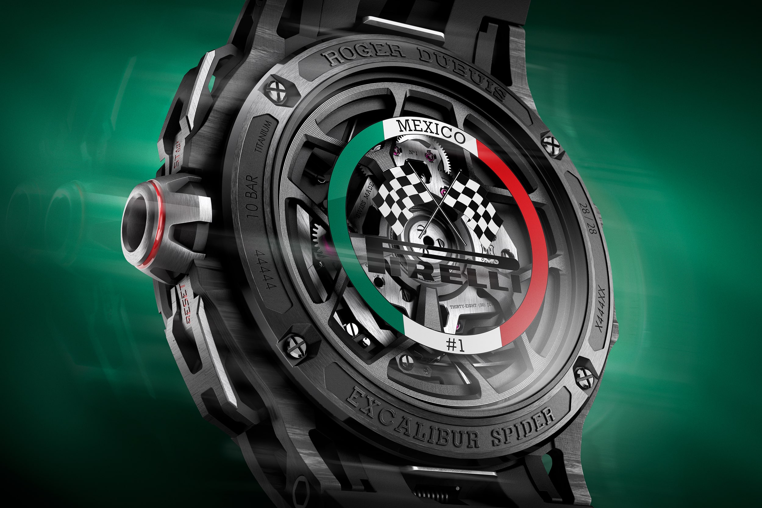 La edición México de 28 unidades del Excalibur Spider Pirelli Flyback Chronograph es una máquina que late con el pulso de los circuitos y con el orgullo tricolor. Alta relojería con olor a asfalto caliente.