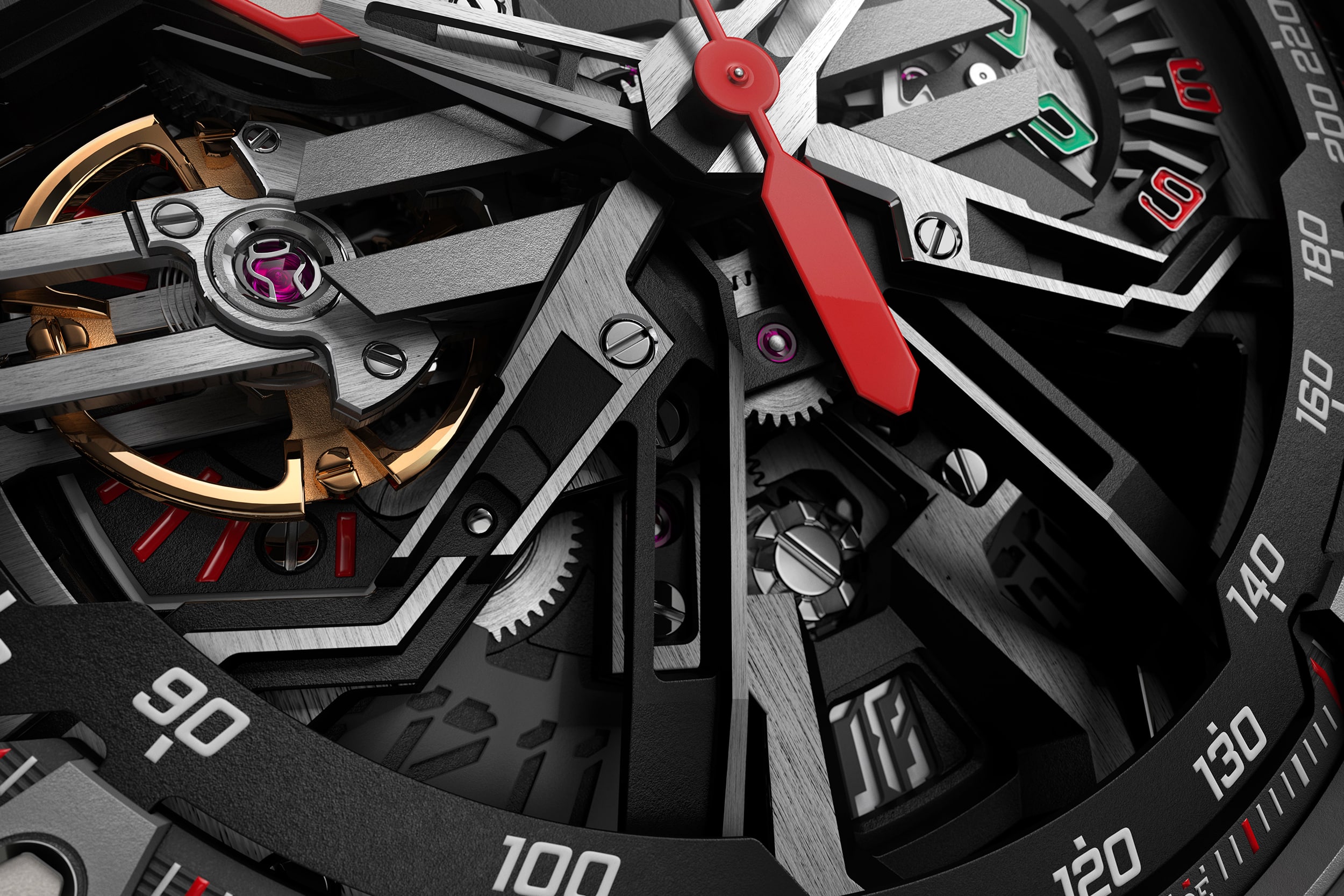 El homenaje a México se siente desde el primer vistazo: los verdes, blancos y rojos se cuelan en índices, detalles del contador y el fondo transparente, donde aparece el nombre México y los símbolos de carrera que sellan la inspiración. Pero la fiesta cromática es solo la entrada. Tiene una caja de 45 mm en carbono negro con bisel de cerámica, ligera como un monoplaza y lista para aguantar curvas a toda velocidad. La arquitectura abierta de la carátula luce capas superpuestas que replican la energía visual de un motor visto desde su esqueleto.
