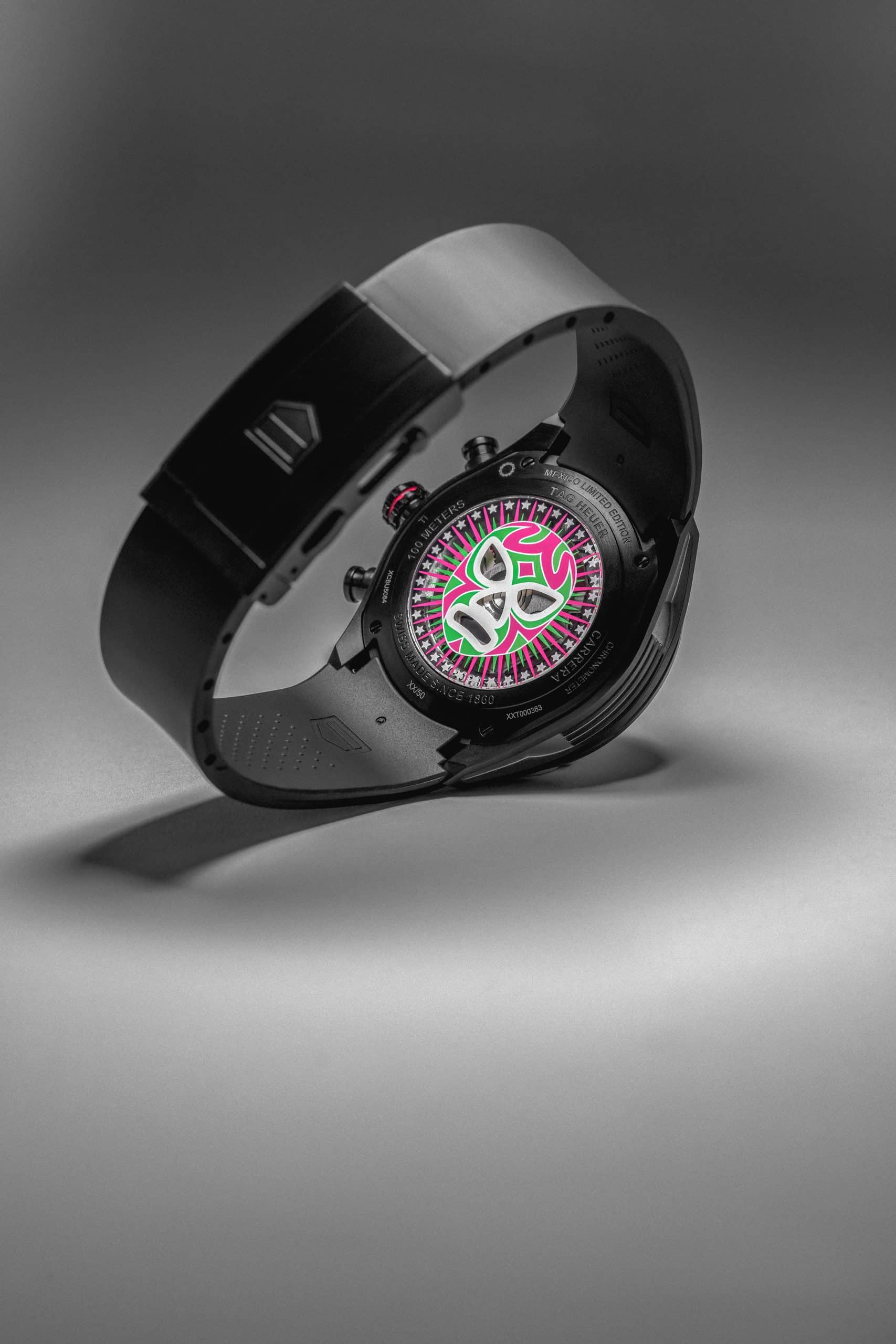 La estรฉtica no escatima dramatismo: caja de titanio con recubrimiento DLC negro, bisel de carbono forjado, reborde fucsia con escala de 60 segundos y manecillas con SuperLumiNova. Y como buen luchador enmascarado, hay contraste y actitud en cada รกngulo: verde, fucsia y negro se combinan en una sinfonรญa cromรกtica que parece salida del cuadrilรกtero.