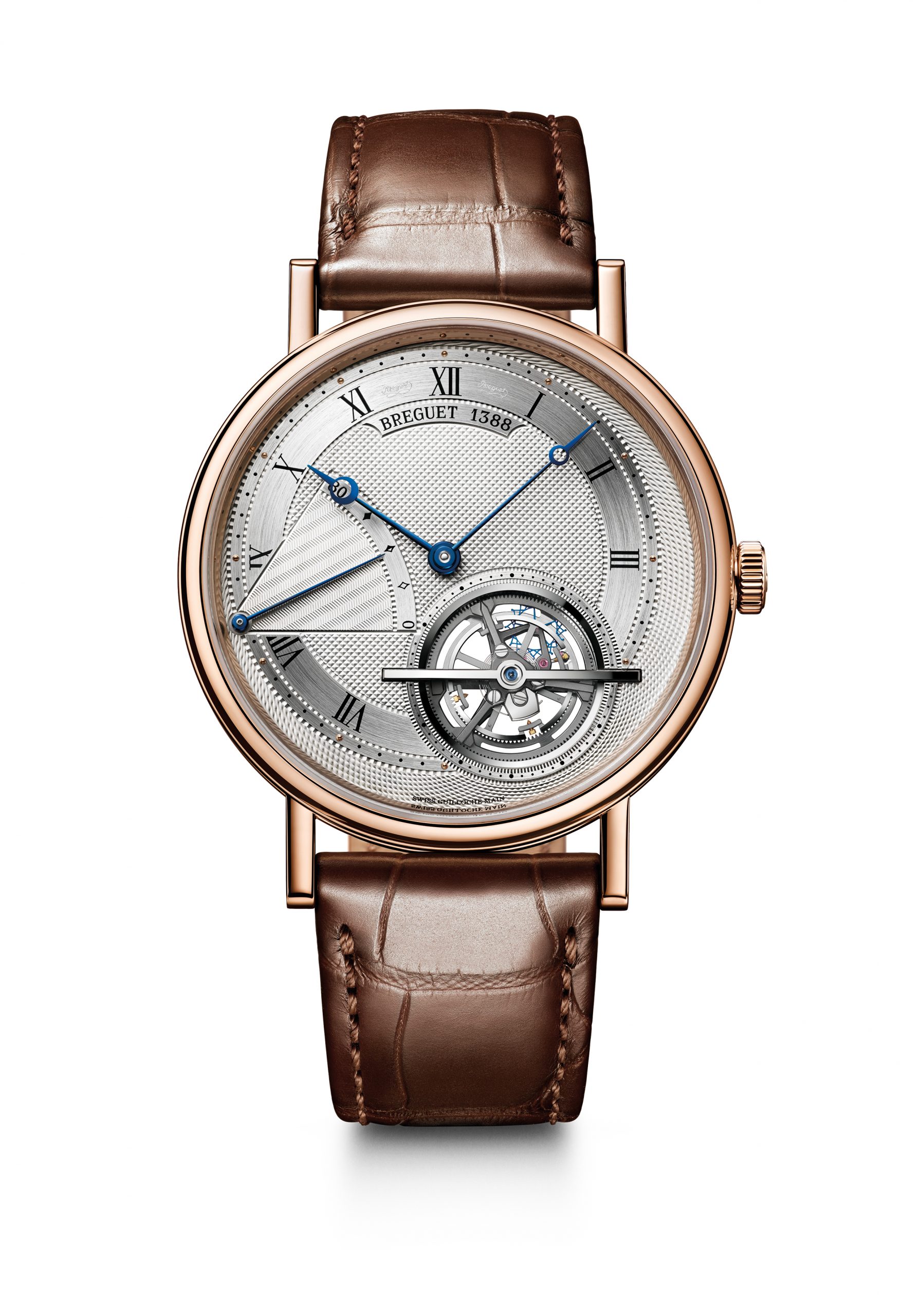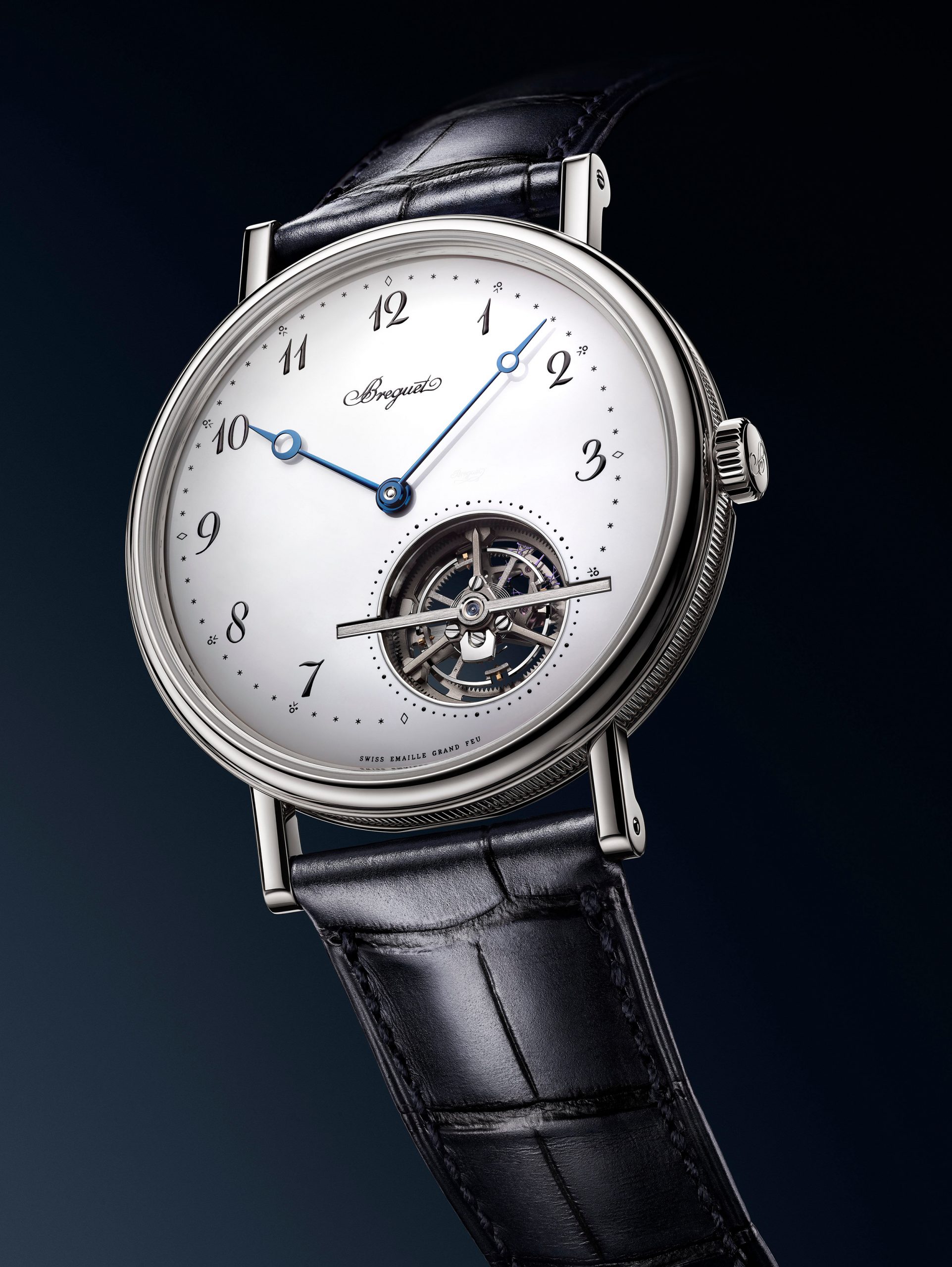 Classique Tourbillon Extra-Plat 5367. Pieza de platino de 41 mm con carrura acanalada y esmalte grand feu para la carátula. Tourbillon a las 5 con una barrita biselada a mano. En su jaula, la firma secreta, introducida en 1795 por Abraham-Louis Breguet. El calibre extrafino automático 581 mide 3 mm y aporta 80 h de reserva de marcha.