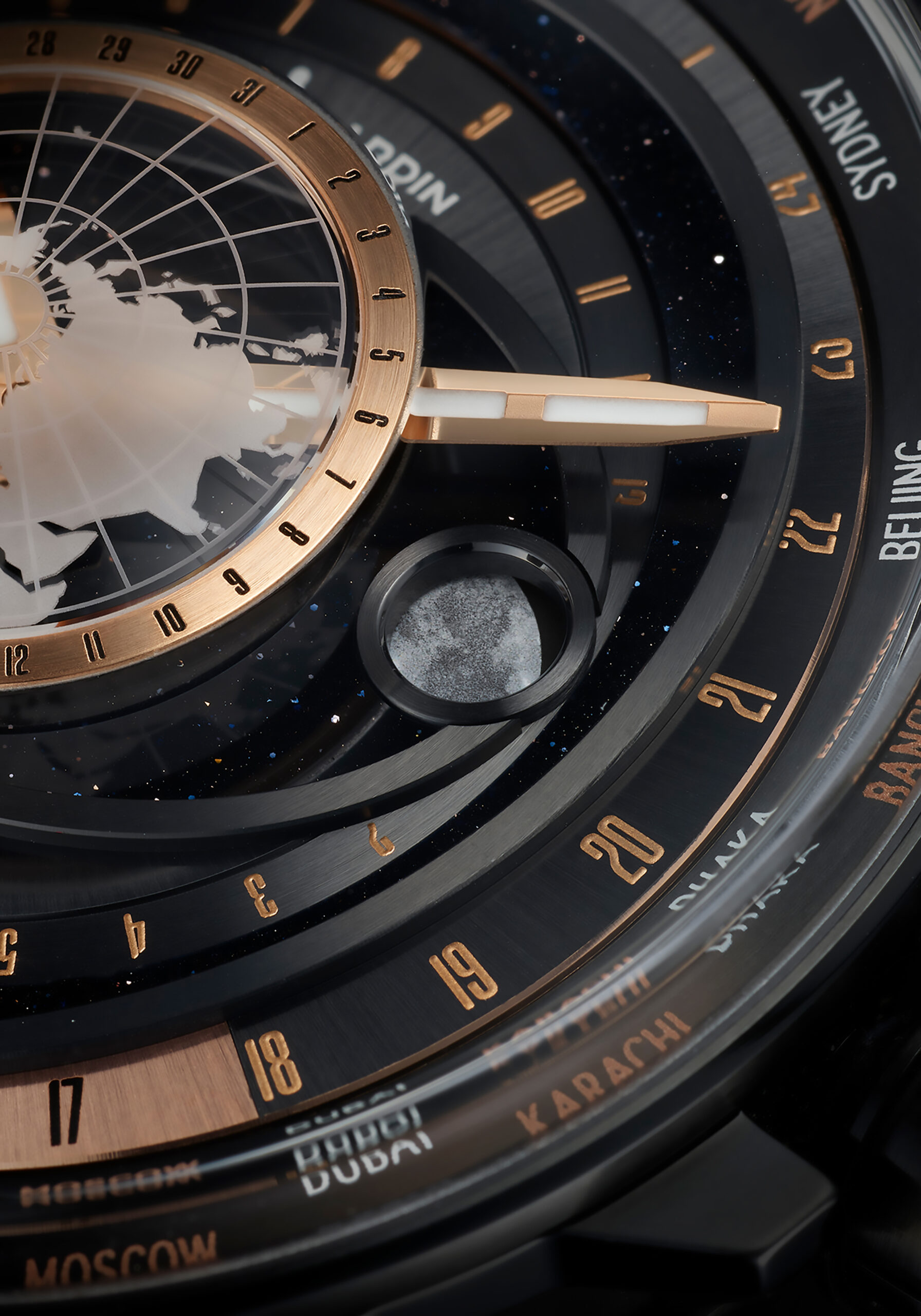 La novedad de enfoque del nuevo reloj del genio relojero es que pasa de una representación copernicana de nuestro sistema solar a un concepto geocéntrico. La razón es que es más fácil de leer y comprender para los que no son expertos en astronomía. Para conseguirlo, optaron por colocar la parte del Hemisferio Norte vista desde el Polo Norte en el centro del cristal de zafiro. Para aumentar el impacto del efecto 3D, el cristal abovedado, con las masas terrestres grabadas en miniatura en el interior, está fijado a la caja rodeada por un anillo de oro rosa. Este anillo está grabado con los 31 días del mes.